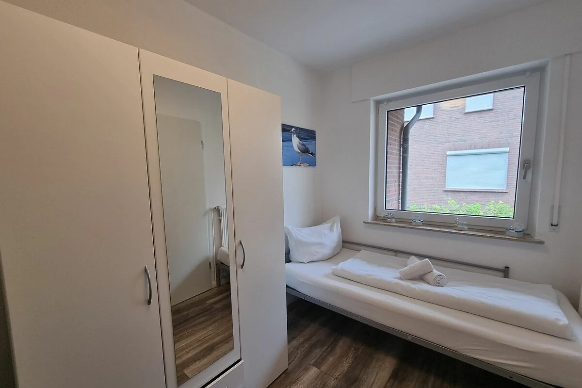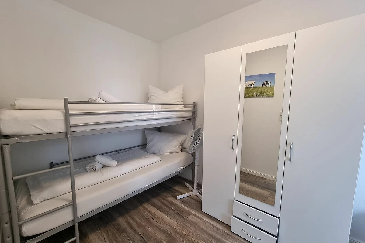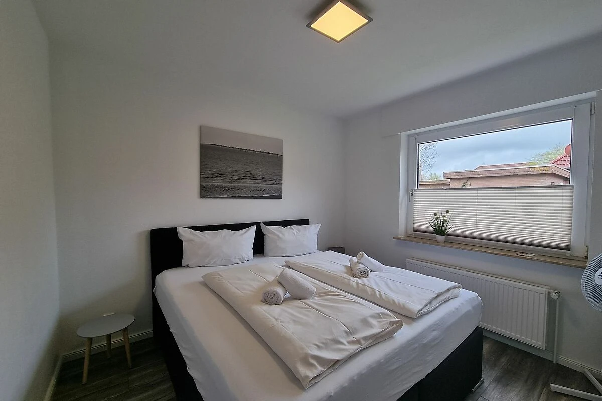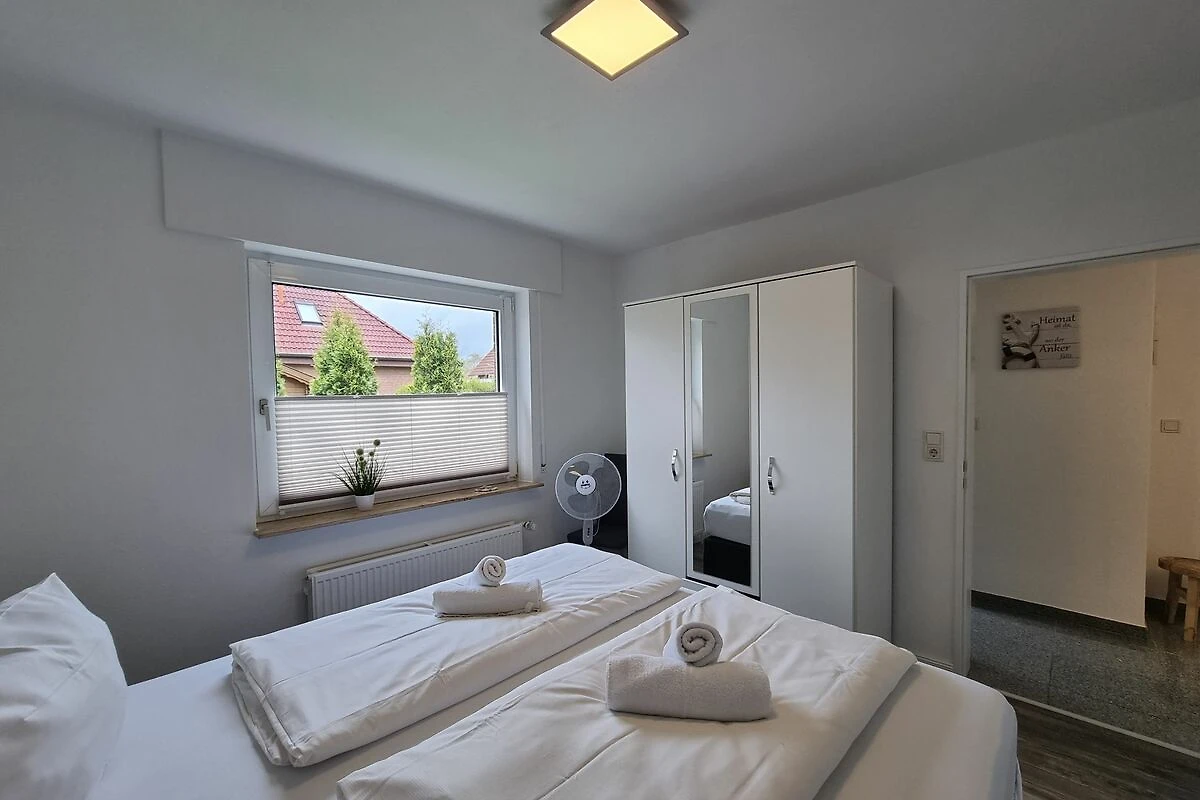 Die Ferienwohnung verfügt über zwei komfortable Schlafzimmer, die für erholsamen Schlaf sorgen. Das Badezimmer ist modern gestaltet, mit ebenerdiger Dusche und Tageslicht ausgestattet und bietet ausreichend Platz. Bettwäsche und Handtücher können auf Wunsch gegen Aufpreis hinzugebucht werden.