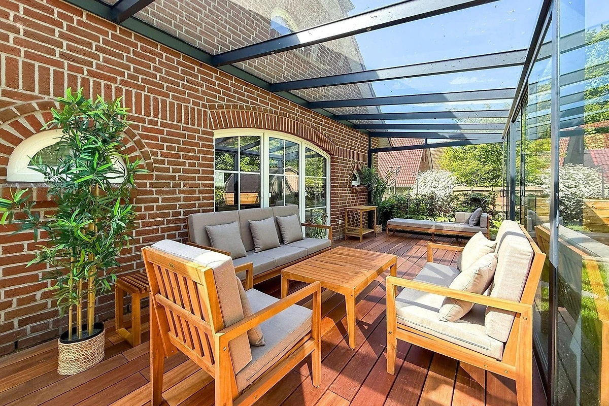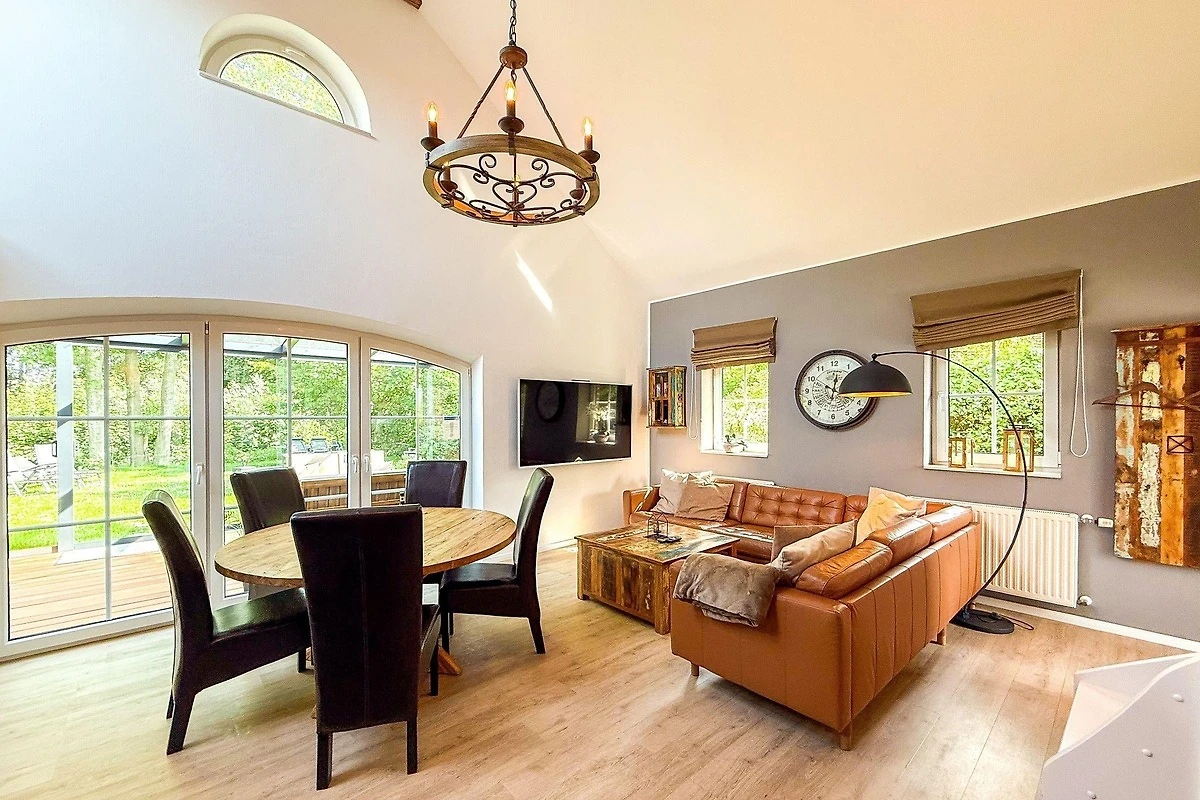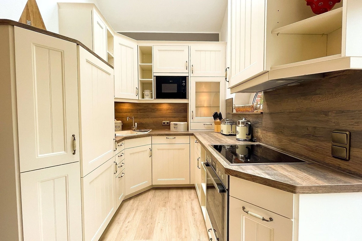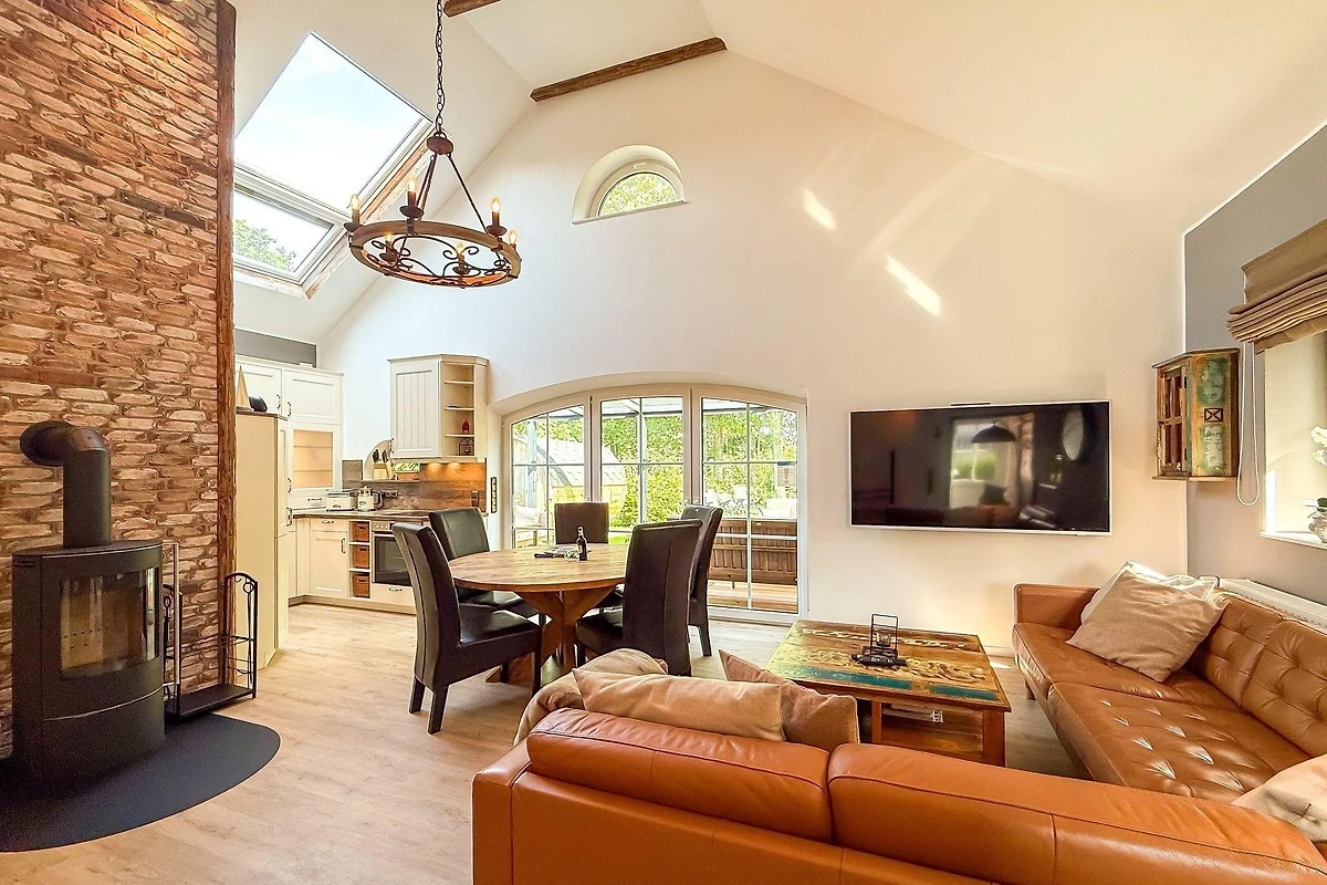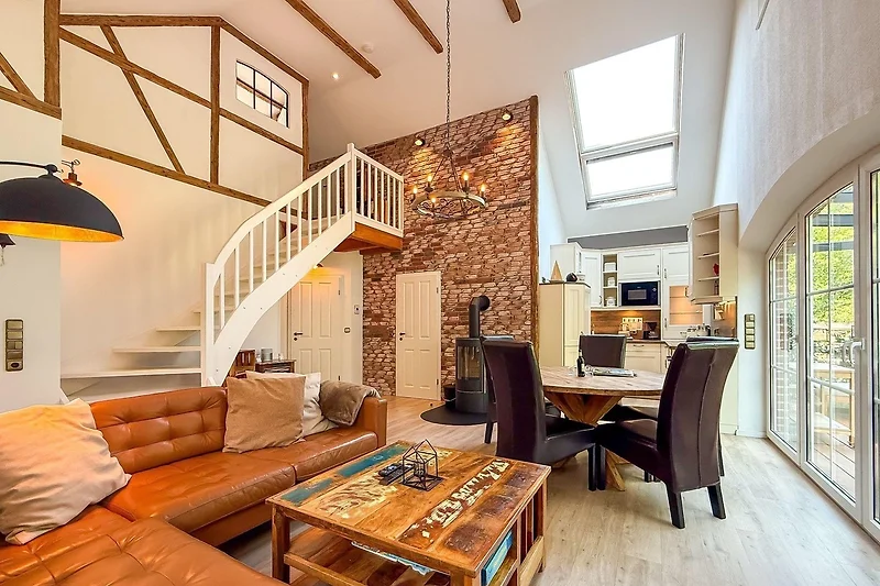 Die offene Küche begeistert mit modernen Geräten, darunter ein Geschirrspüler, Elektro- und Gasherd, Backofen und Mikrowelle—ideal für kulinarische Momente. Ein gemütlicher Esstisch bietet Platz für gemeinsame Mahlzeiten. Die liebevoll gestalteten Wohnräume verfügen über ein Sofa, Kamin und eine moderne HiFi-Anlage.