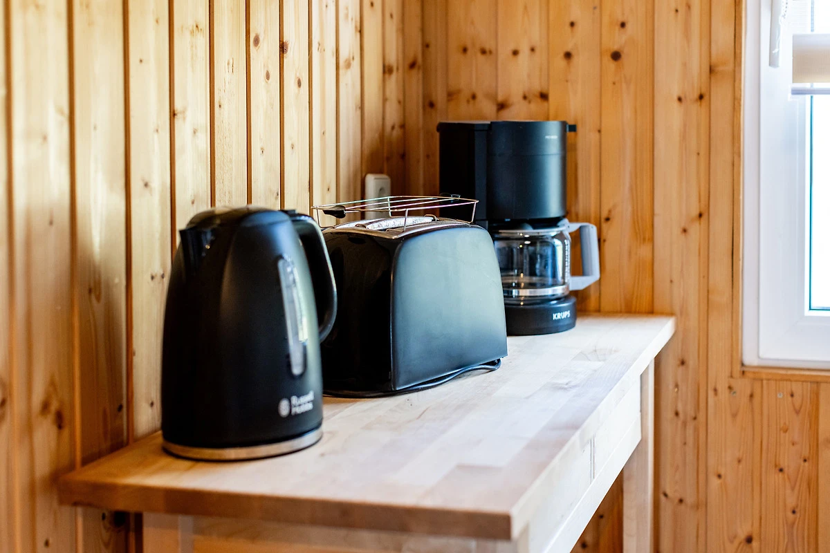 -> Toaster, Kaffeemaschine, Wasserkocher sind vorhanden