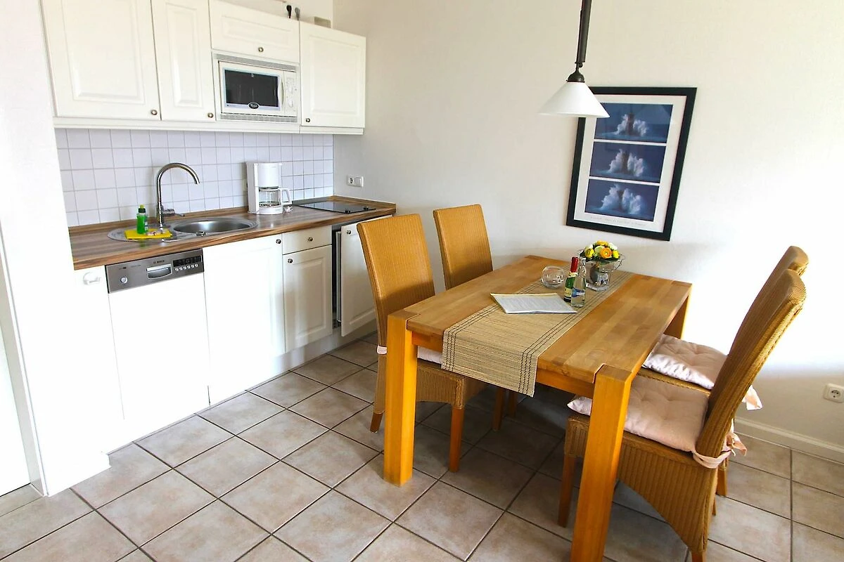 Die integrierte Küchenzeile verfügt über ein 2- Plattencerankochfeld, Mikrowelle, Kühl-/Gefrierkombination, Kaffeemaschine, Toaster sowie Geschirr, Töpfe und alles was man braucht. Ebenso ein Esstisch mit 4 Stühlen.