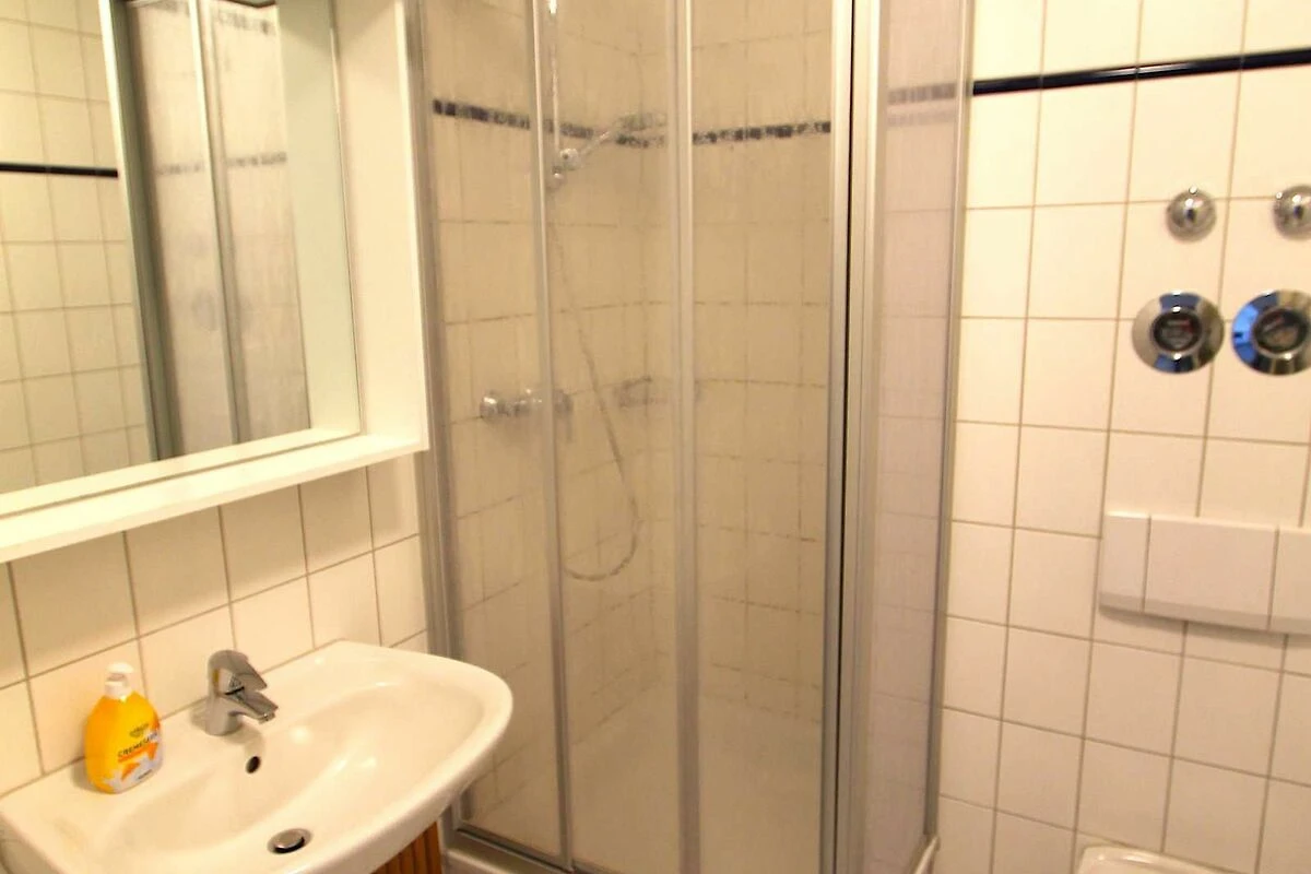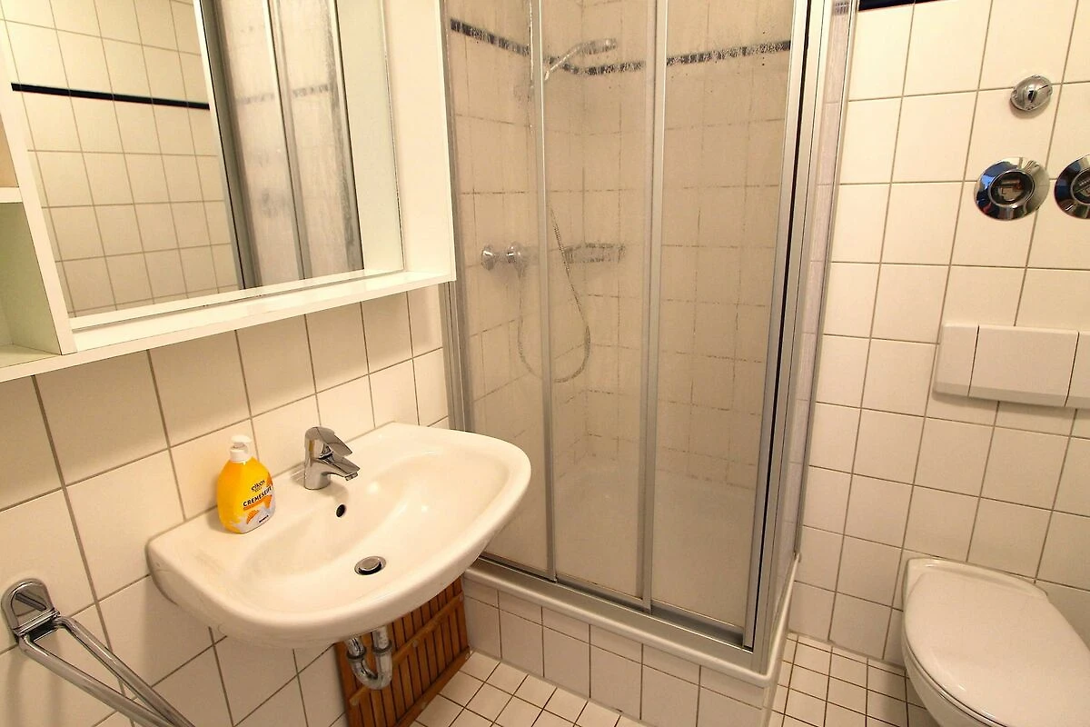 Duschbad mit Waschbecken, Handtuchheizkörper und WC.