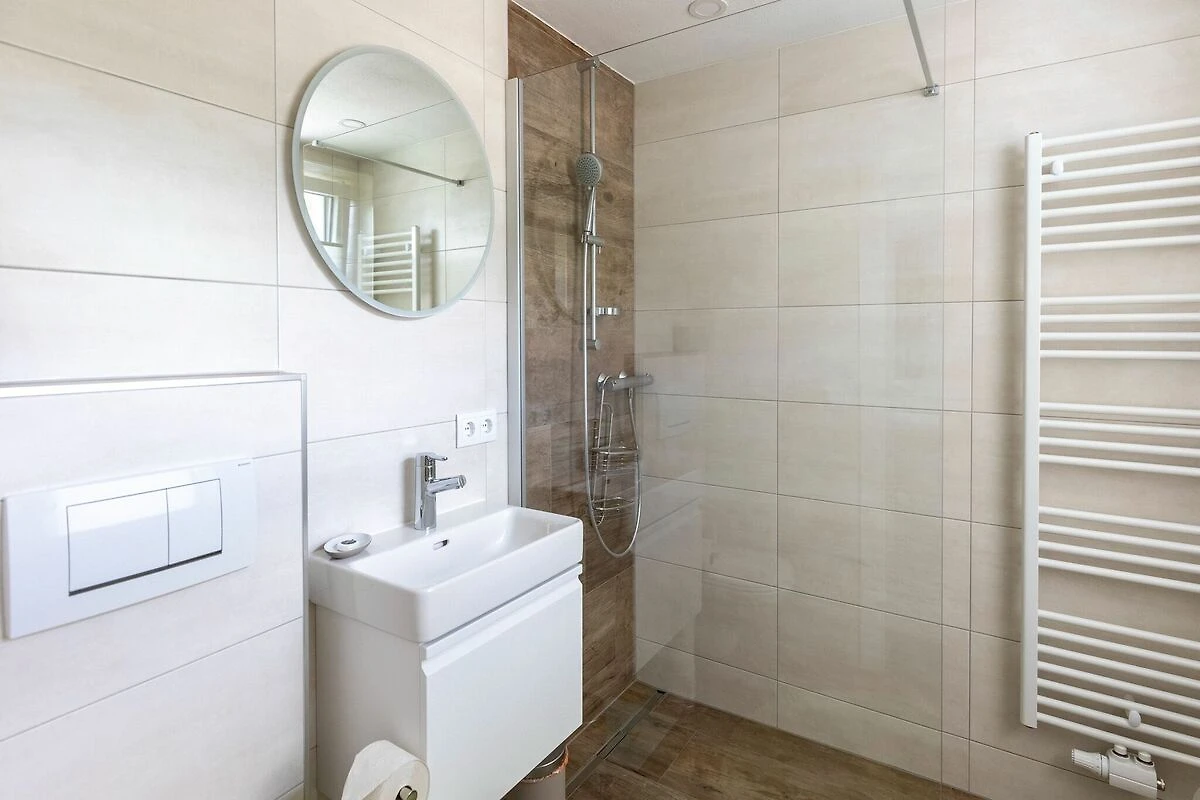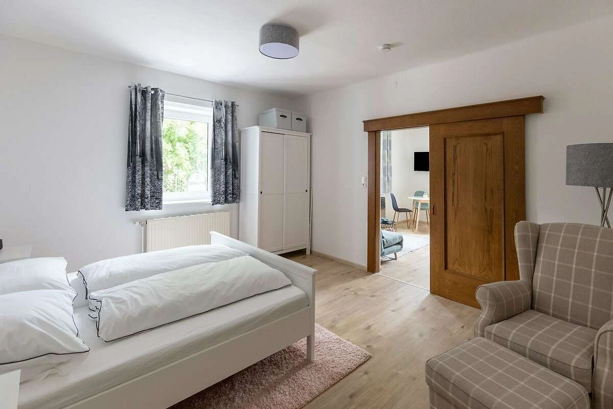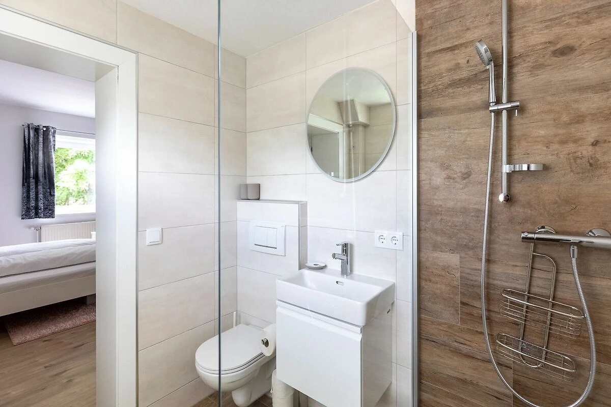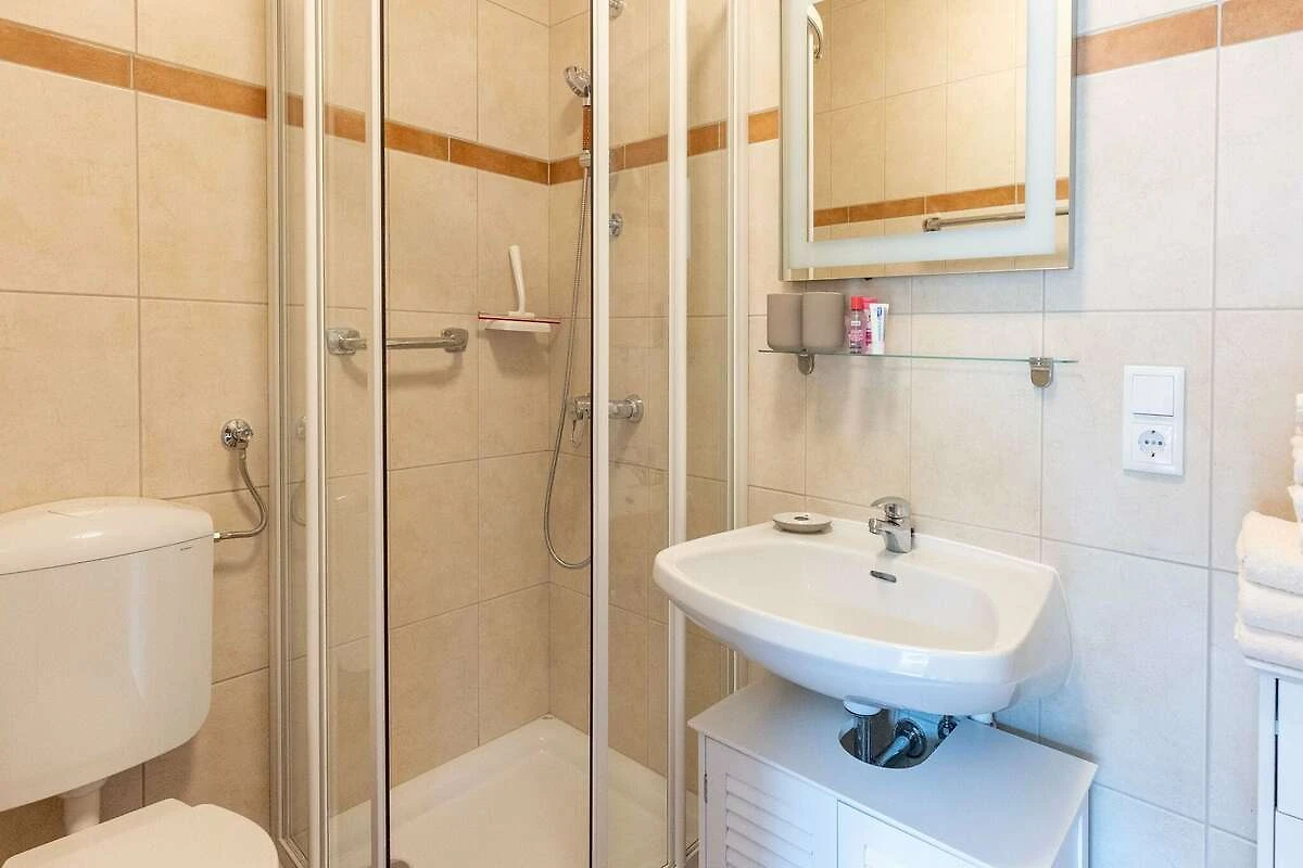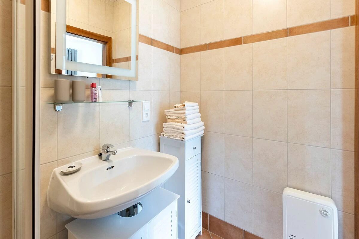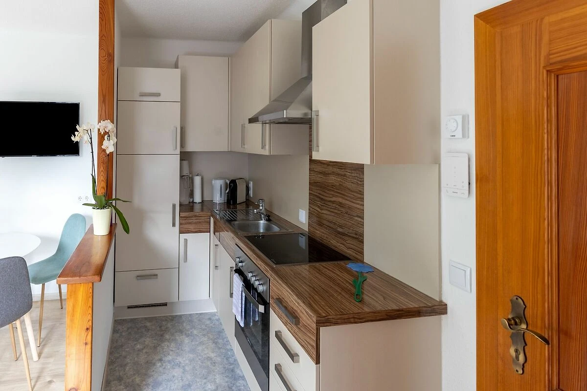 2. Gästeunterkunft in der 1. Etage: (Eingang, Wohnzimmer(Schlafcouch 1 Pers.(145 x 190 cm), TV, Radio), Küche(Wasserkocher, Toaster, Backofen, Mikrowelle, Spülmaschine, Kühlschrank), Schlafzimmer(Doppelbett king size(180 x 200 cm)), Badezimmer(Dusche, Waschbecken, Toilette, Föhn))