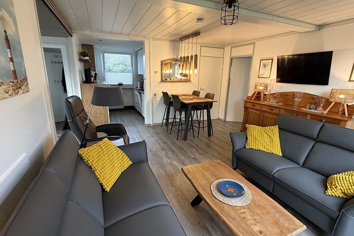 Wohnfläche ca. 75 qm. Ein gemütlich eingerichteter Wohnraum mit Essbereich. Eine komplett eingerichtete Küche mit Elektroherd und Elektrobackofen, Kühlschrank, Gefrierfach, Spülmaschine, Waschmaschine, Trockner und Mikrowelle. TV (Smart-TV) mit deutschen Programmen per Satellit im Wohnraum und allen Schlafzimmern, zusätzlich alle TV-Geräte mit Amazon Fire TV Stick (es muss der eigene Amazon-Zugang genutzt werden). WiFi (Glasfaser) kostenlos nutzbar.