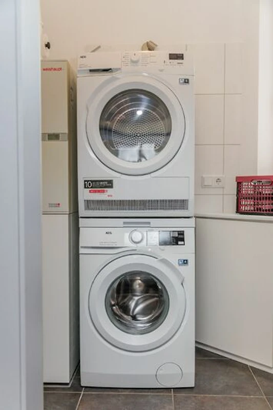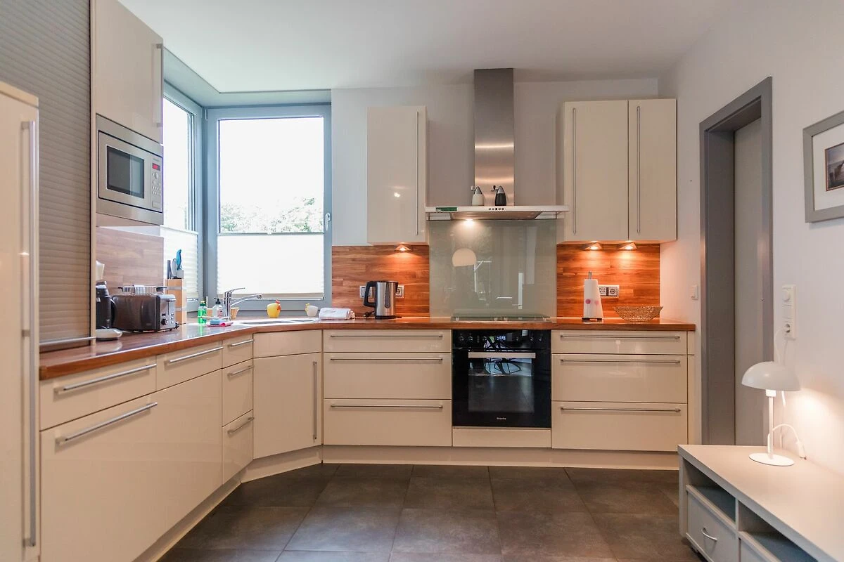 Im Erdgeschoss befinden sich der großzügige Wohn-Essbereich mit offener Küche und ein Duschbad, sowie ein Hauswirtschaftsraum mit Waschmaschine und Trockner. Vom Essbereich aus haben Sie direkten Zugang auf die überdachte Terrasse und in den Garten. Hier befindet sich auch der Kaminofen, welcher an kühleren Tagen für wohlige Wärme sorgt. Auch eine JBL-Musikbox finden Sie im Haus vor. Die Küche ist mit hochwertigen Geräten ausgestattet, u. A. mit einer Tassimo-Kaffeemaschine.