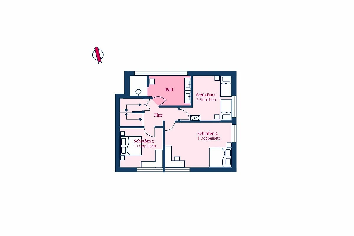 Im Obergeschoss befinden sich die drei Schlafzimmer sowie ein weiteres Duschbad. Zwei der Schlafzimmer verfügen über je ein Doppelbett, das dritte verfügt über zwei Einzelbetten. In einem Schlafzimmer befindet sich ein Arbeitsplatz. Das Duschbad ist sehr großzügig gehalten und bietet Ihnen einen schönen Ausblick auf die umliegende Landschaft.