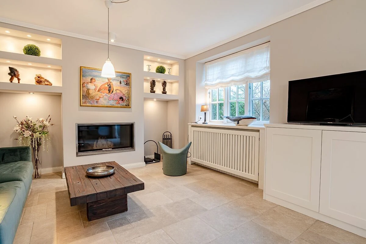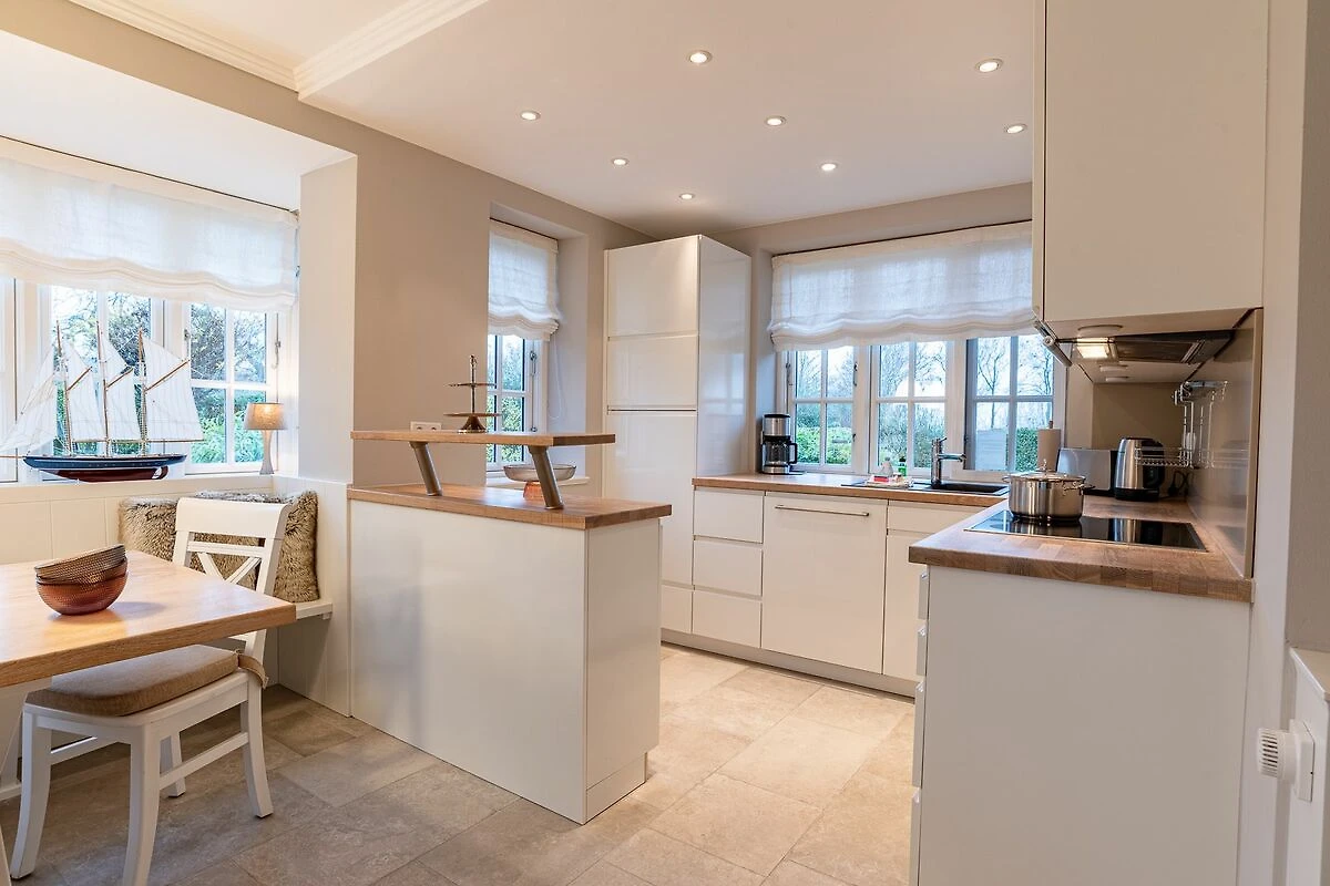 Großzügig, lichtdurchflutet, komfortabel - Adjektive, die durchaus sehr gut zur Beschreibung der reetgedeckten Doppelhaushälfte Friesenliebe verwendet werden können. Der Architekt, der die Immobilie entworfen und gebaut hat, ist spezialisiert auf den Bau von hochwertigen Immobilien auf Föhr zur Vermietung dieser an Feriengäste. Dies spiegelt sich in den Raumaufteilungen, der großzügigen Ausstattung und in diversen Details der Ferienwohnung wieder. Es finden maximal 5 Personen plus Kleinkinderaufbettungen Platz, aufgeteilt in zwei Schlafzimmern. Zwei Bäder, eine Sauna und ein Kamin runden das Angebot ab. Die Friesenliebe ist auch für Aufenthalte zur kalten Jahreszeit hervorragend geeignet.