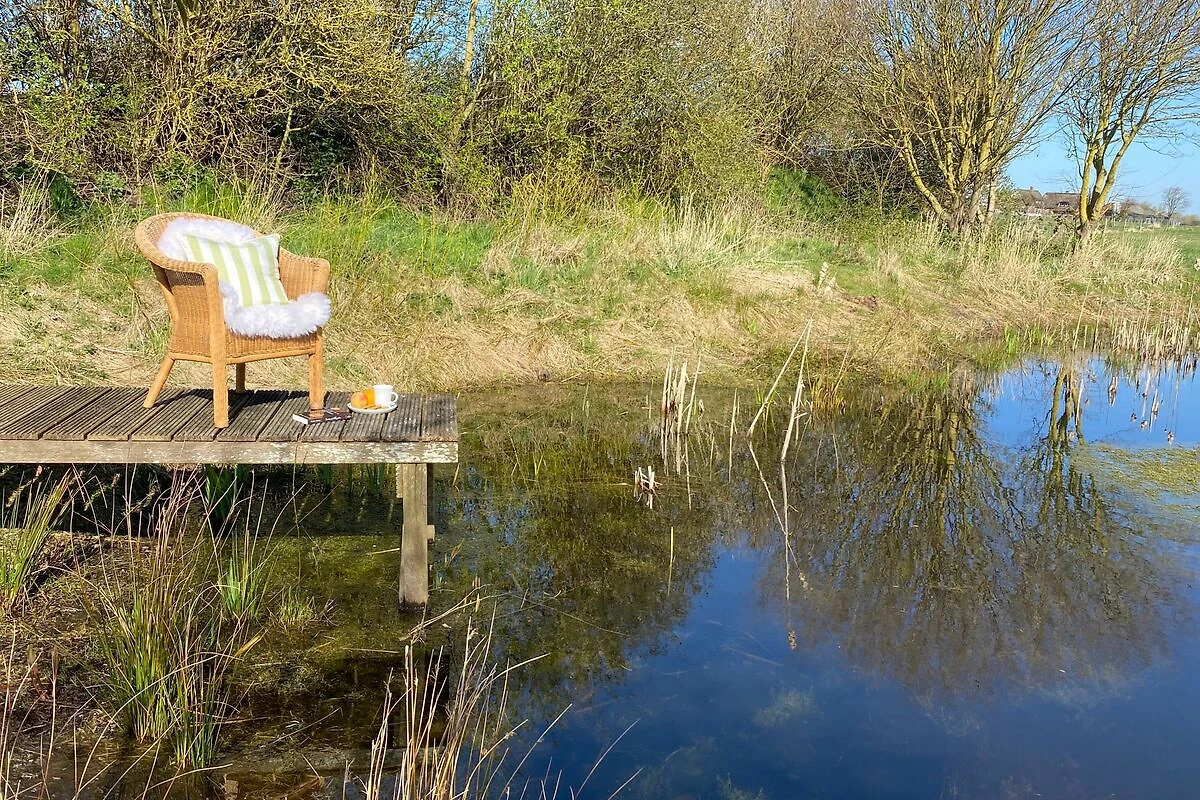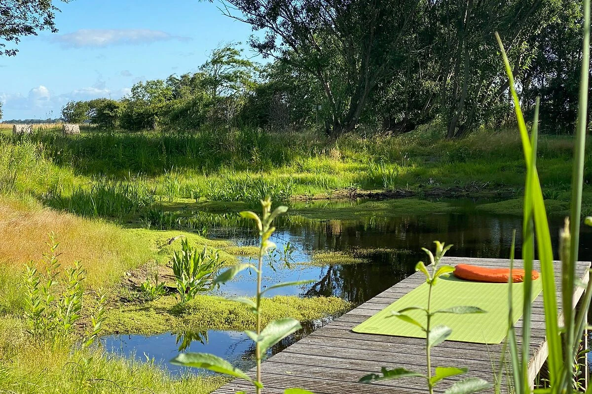Alle Gäste finden hier ihre persönlichen Lieblingsplätze zum Entspannen und Erholen. Entweder in den hellen und modernen Räumen, im Wellness-Bereich mit gemütlichen Lounge-Möbeln, am runden Kaminofen im Wohnzimmer oder outdoor auf der großen blickgeschützten Terrassenfläche mit Strandkorb, Liegen, Deck Chairs und zwei Essbereichen. Wer auf dem Steg am Teich entspannen möchte, erreicht diesen über die Naturwiese. Je nach Temperaturen und Wetterlage kann es sein, dass der Teich im Hochsommer und Frühherbst wenig bis kein Wasser enthält.