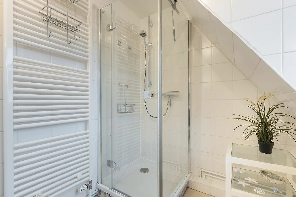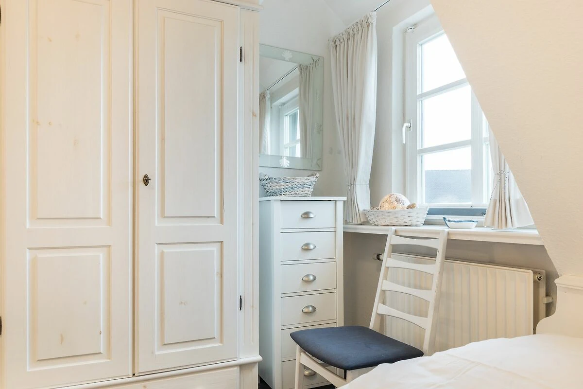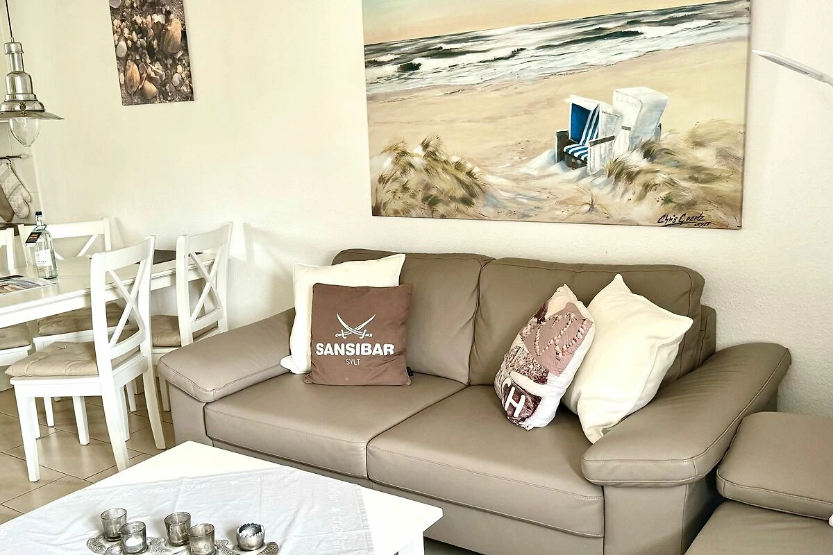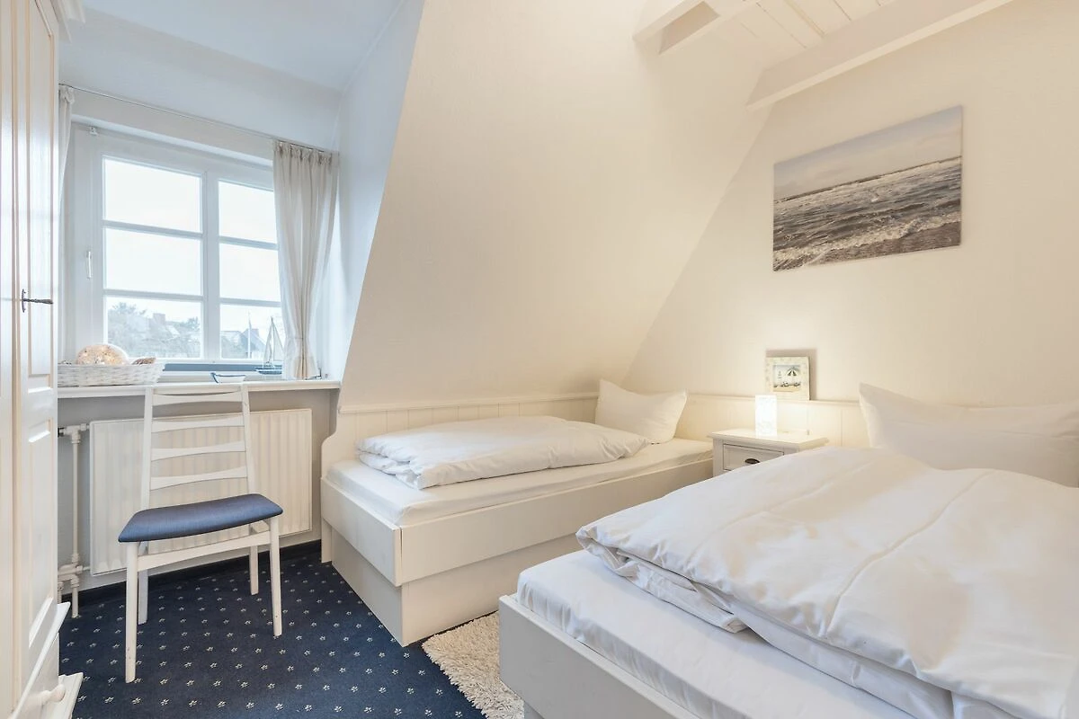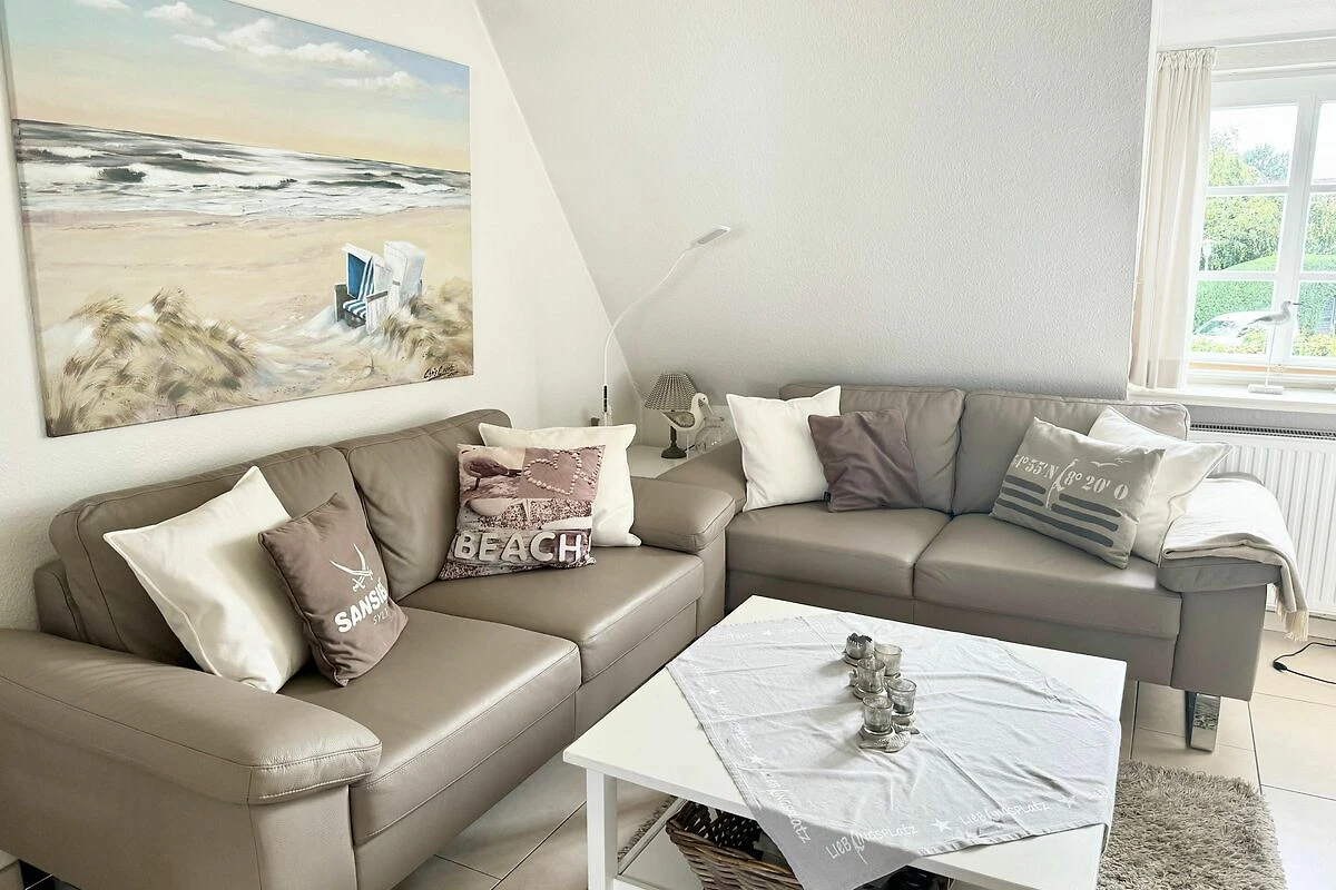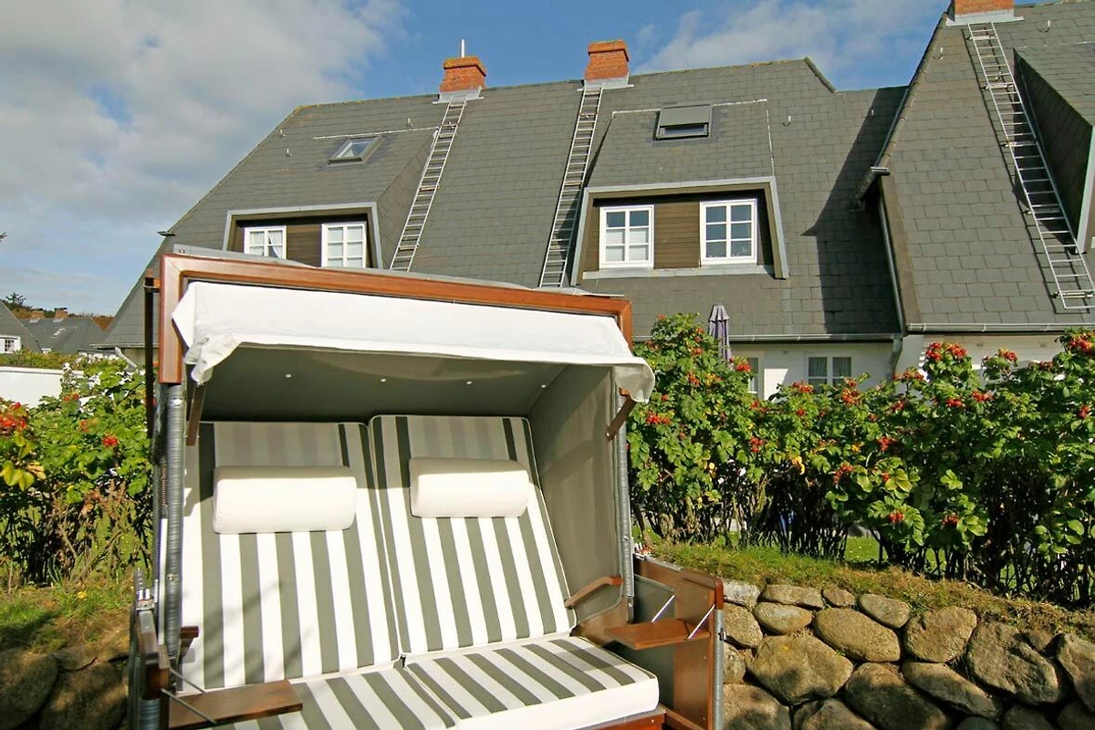 Diese, im Landhausstil liebevoll eingerichtete und komfortabel ausgestattete 3 Zimmer-Maisonette Ferienwohnung (ca. 60 qm) mit eigenem Eingang, liegt ruhig gelegen in einem Mittelhausteil in Westerland. Die Ferienwohnung verteilt sich über zwei Ebenen (Obergeschoss und Dachgeschoss). Das Obergeschoss verfügt über einen gemütlichen Wohn- / Essbereich mit moderner neuer Ledergarnitur und angrenzender Küche (Cerankochfeld, Backofen, Mikrowelle, Kühlschrank), eine Diele, ein Schlafzimmer mit zwei Einzelbetten und ein Duschbad mit WC. Im Wohnzimmer befinden sich ein Flatscreen mit einem DVD Player (Blue- Ray) sowie ein Telefon mit Flatrate (nur in das deutsche Festnetz) und natürlich Internet-Flatrate mit WLAN. Im Dachgeschoss steht Ihnen ein gemütliches Doppelbett mit einem weiteren Flatscreen und DVD-Player zur Verfügung. Zwei große Velux-Fenster mit Solar-elektrischen Rollos bringen viel Licht in den Raum und bieten die Möglichkeit zum Querlüften. Diese gepflegte Einheit liegt am Friesenhain, ein Wohnpark am Nordwäldchen von Westerland. Der Strand ist in direkter Nähe. In der Sonnenkuhle, im Gemeinschaftsgarten, erwartet Sie ein Strandkorb und Gartenmöbel. Ein Pkw-Stellplatz befindet sich am Haus. Fahrradständer für das gesamte Haus liegen im Innenhof. Haustiere sind in dieser Wohnung nicht erlaubt.