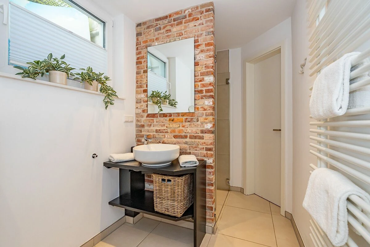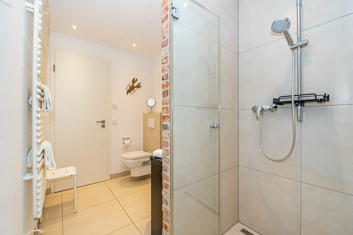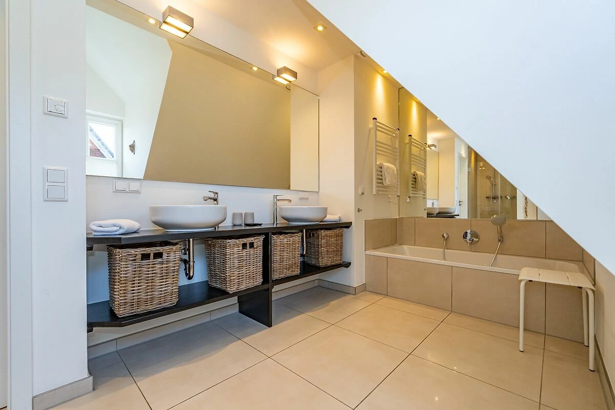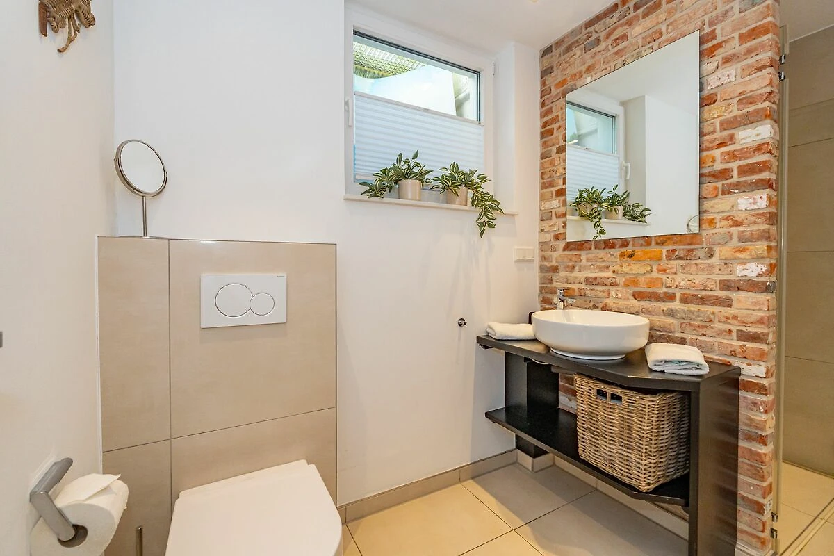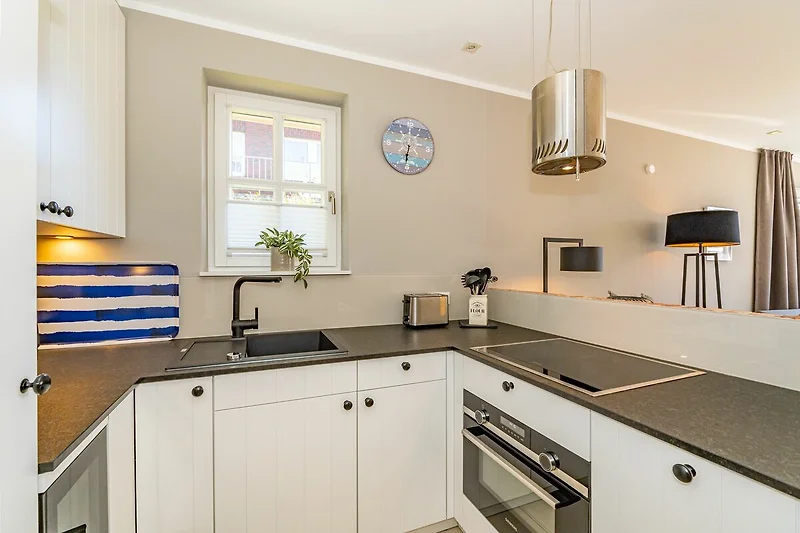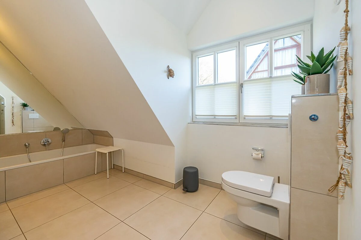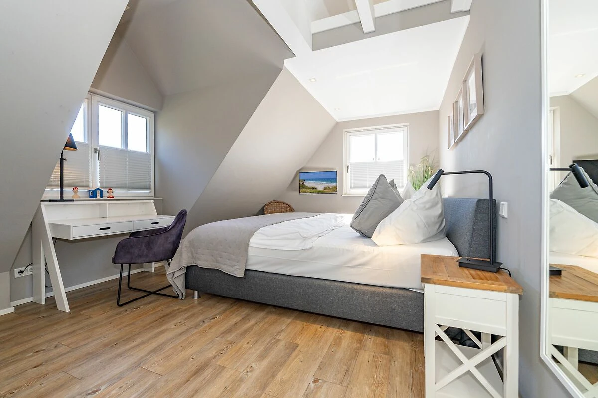 Das Anker Hus liegt ruhig gelegen, direkt am Friedrichshain. Im Erdgeschoss der Ferienhaushälfte betreten Sie als erstes den Eingangsbereich und Flur. Von dort aus haben Sie Zugang zum Gäste WC und zum hellen Wohn- und Essbereich mit offener Küche. Die offene Küche ist ausgestattet mit einem Backofen, Kaffeemaschine, Nespressomaschine, Mikrowelle und Geschirrspüler. Im hellen Wohn- und Essbereich erwartet Sie eine gemütliches Sofa, TV und ein Esstisch. Von hier aus haben Sie direkten Zugang zur Terrasse mit Gartenmöbeln und Strandkorb (saisonal). Über eine Treppe vom Flur aus erreichen Sie das Obergeschoss. Dort befindet sich ein Schlafzimmer mit Doppelbett, TV und ein Badezimmer mit Badewanne, Dusche und Doppelwaschtisch. Vom Wohn- und Essbereich erreichen Sie über eine Treppe das Souterrain. Hier befindet sich das zweite Schlafzimmer mit Doppelbett und TV und weiteres Badezimmer mit Dusche, Waschbecken und WC. Bitte beachten Sie, dass das Anker Hus ein Nichtraucherhaus ist.