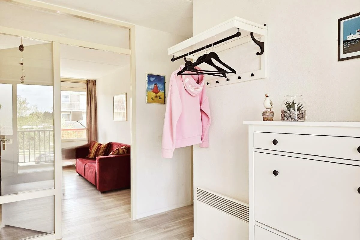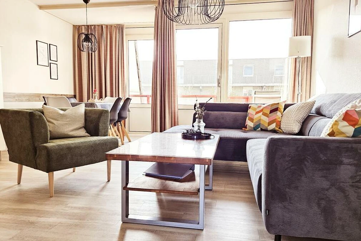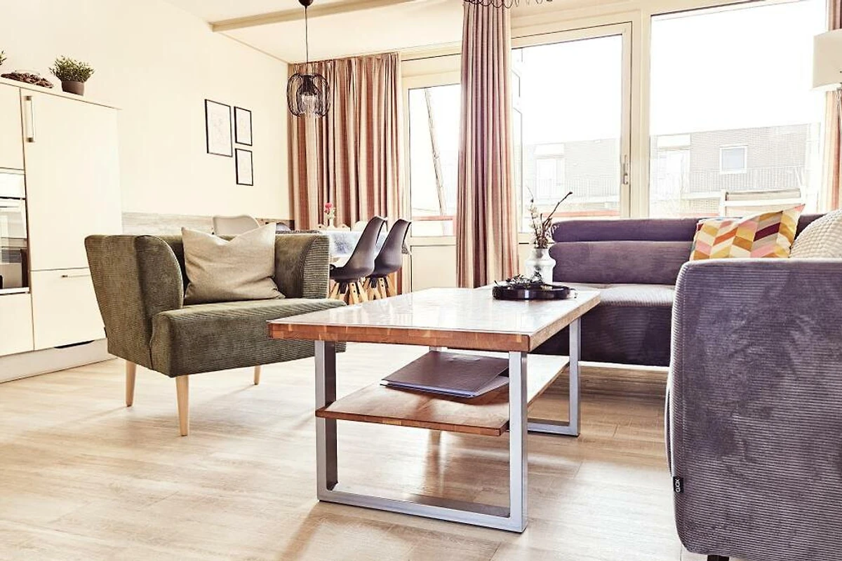 Unsere geräumige, nach Süden zum Innengarten ausgerichtete Ferienwohnung befindet sich in der 1. Etage des bekannten "Amelander Paradijs" - ein Fahrstuhl ist selbstverständlich vorhanden! Sie geniessen die Sonne auf dem windgeschützten Balkon und haben kurze Wege zum Fahrradabstell- und KFZ-Stellplatz. Lichtdurchflutete 75 qm bieten Ihnen ausreichend Platz für 5 Personen. Das gemütliche Wohnzimmer ist ausgestattet mit einem grosszügigen Sofa und verfügt über einen Flat-TV. Wir empfangen viele deutsche Programme. Die sehr schöne und praktische Küchenzeile verfügt über eine Spülmaschine, Mikrowelle, einen Kühlschrank, einen Backofen und eine Kaffeemaschine - hier können Sie sowohl mehrere Gänge als auch "auf die Schnelle" etwas zubereiten. Die Wohnung verfügt über 2 Schlafzimmer. Die Verdunklungsgardinen in beiden Räumen sorgen dafür, dass es auf Wunsch komplett abgedunkelt ist. Im 1. Schlafzimmer finden Sie ein Boxspringbett mit den Maßen 1,80 x 2,00 m vor. Ein Flat-TV gehört ebenso zur Ausstattung wie der direkte Zugang zum Balkon. Das 2. Schlafzimmer verfügt über ein Etagenbett sowie über ein einzelnes Bett 90 x 2,00 m. Das moderne, erst kürzlich renovierte Badezimmer ist ausgestattet mit einer grossen begehbaren Dusche 90 x 1,00 m und einem extra grossen Waschtisch. Das WC befindet sich separat neben dem Bad. Bei uns surfen Sie im WLAN kostenfrei. Ausreichend Parkplätze stehen ebenso kostenfrei zur Verfügung wie auch die Lademöglichkeiten für E-Bikes.In dieser Wohnung steht ein Kinderhochstuhl kostenfrei zur Verfügung. Haustiere sind nicht erlaubt.