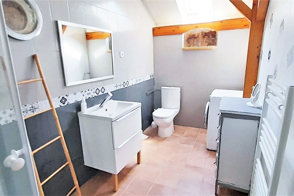 Parterre: (Küche(Wasserkocher, Toaster, Kochherd(Induktion), Dunstabzugshaube, Kaffeemaschine, Espressomaschine, Backofen, Mikrowelle, Spülmaschine, Kühl-/Gefrierkombination, Waschmaschine, Bügelbrett, Bügeleisen), Wohn/Esszimmer(35 m2)(TV, Esstisch, Kaminofen, Sitzecke), Schlafzimmer(Doppelbett(140 x 190 cm)), Badezimmer(Dusche, Waschbecken, Toilette, Waschmaschine))