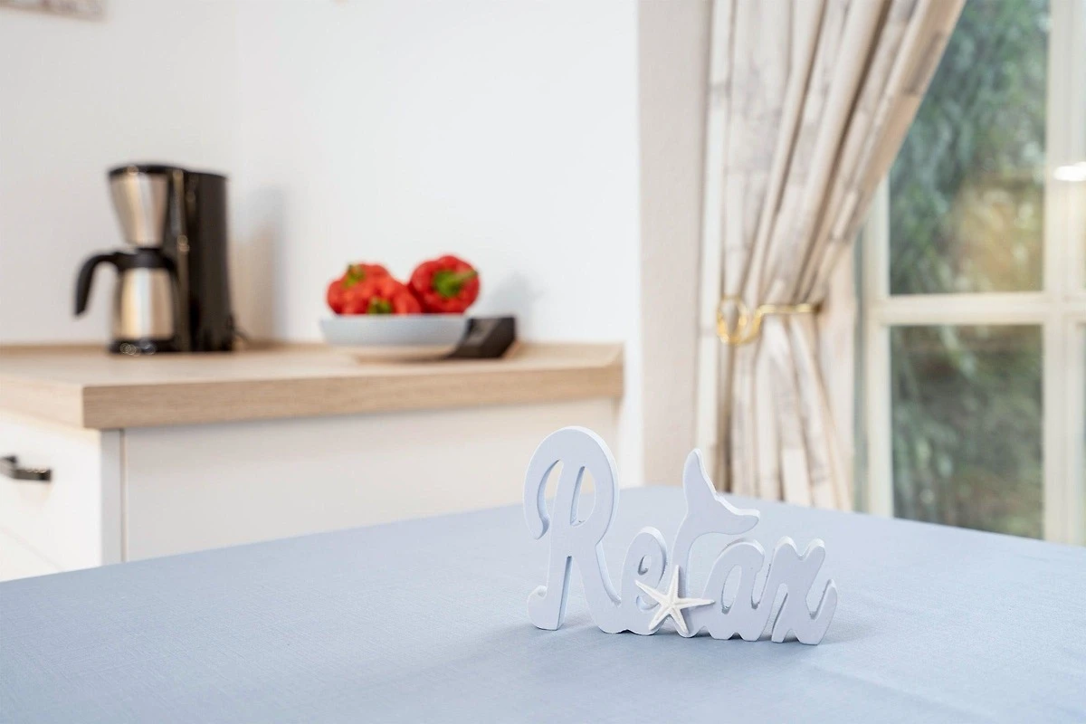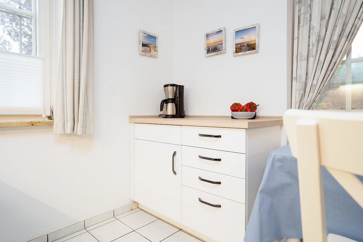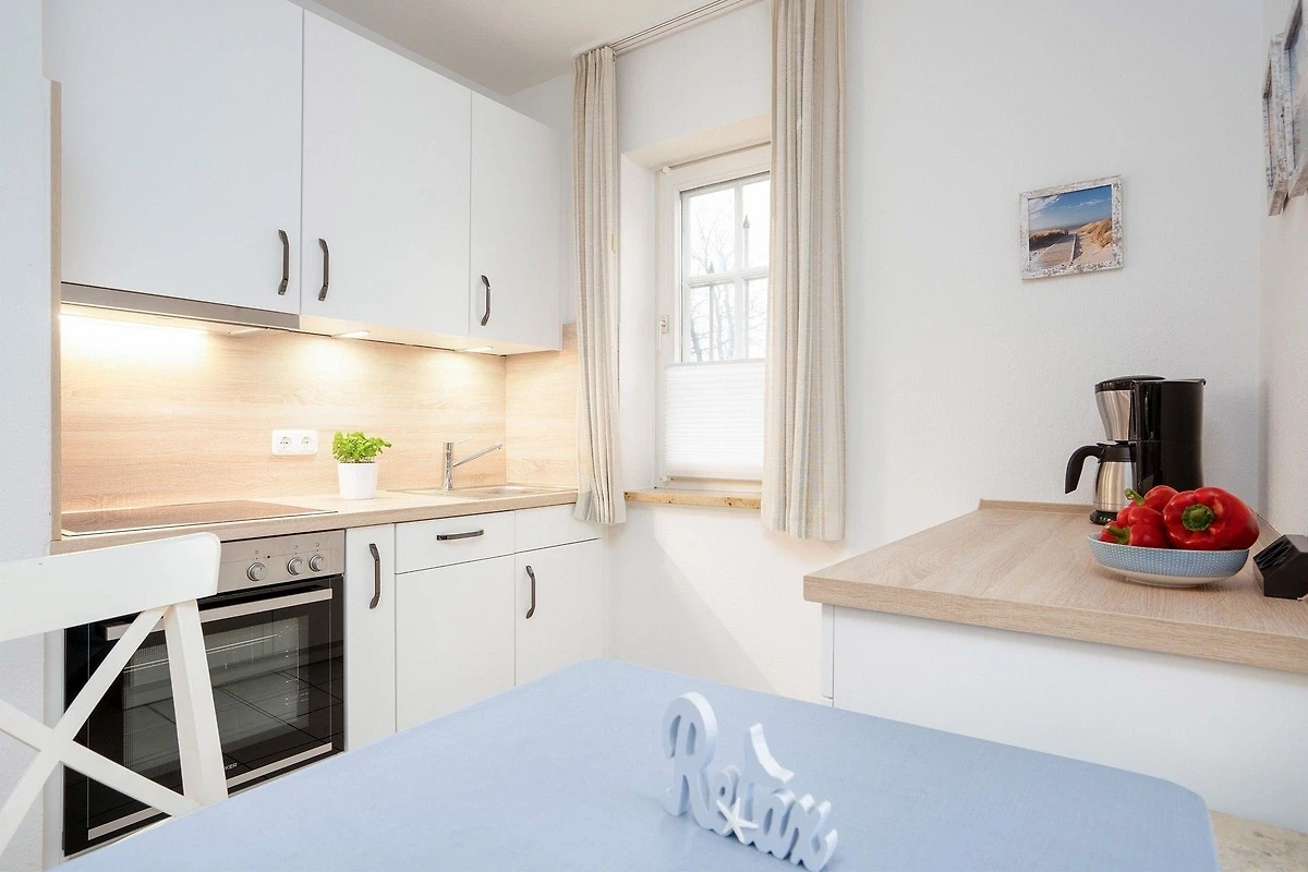 Die strandnahe Ferienwohnung bietet auf etwa 53 qm Platz für maximal 2 Erwachsene und 1 Kind. Der einladende Wohnraum ist mit einem Schlafsofa, Couchtisch und TV ausgestattet und schafft eine gemütliche Atmosphäre. Hier ist der Zugang zur sonnigen Terrasse, die durch Hecken geschützt ist. Die offene Küche verfügt über eine Komplettausstattung, einschliesslich Geschirr, Backofen, Wasserkocher, Kaffeemaschine und Spülmaschine, sowie sämtlichen benötigten Kochutensilien. Das Schlafzimmer beinhaltet ein Doppelbett mit zwei getrennten Matratzen (je 0,80x2,00) und einen Kleiderschrank für ausreichend Stauraum. Das helle Badezimmer mit grossen Fenstern enthält eine Dusche, einen Waschtisch und ein WC. Die Wohnung ist eine Nichtraucherwohnung, kleine Hunde sind auf Anfrage erlaubt. Ein kostenloser PKW-Stellplatz befindet sich direkt am Haus.