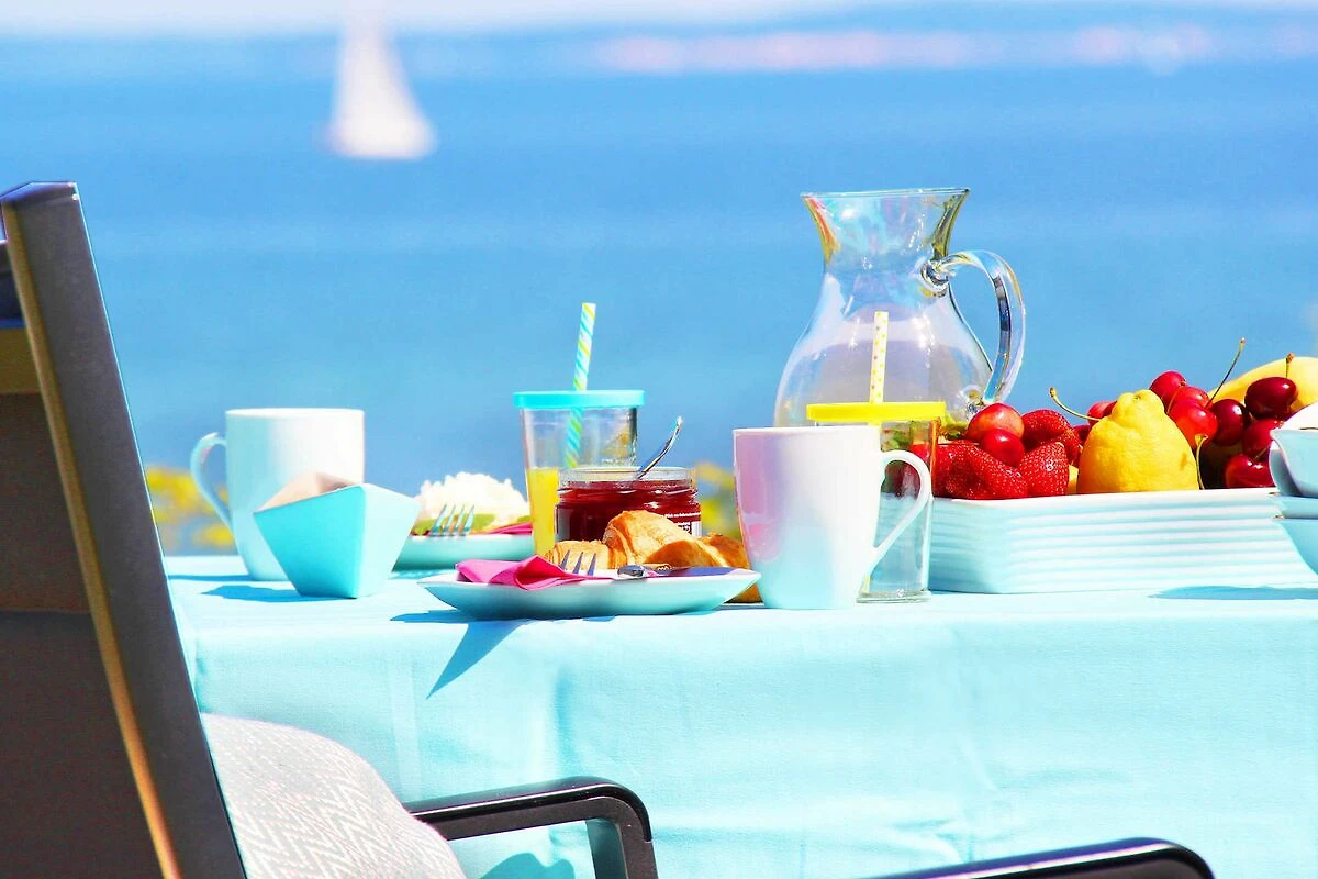 Auf der grossen, teilweise überdachten Terrasse lässt es sich mit Meerblick herrlich entspannen, sonnenbaden und grillen.