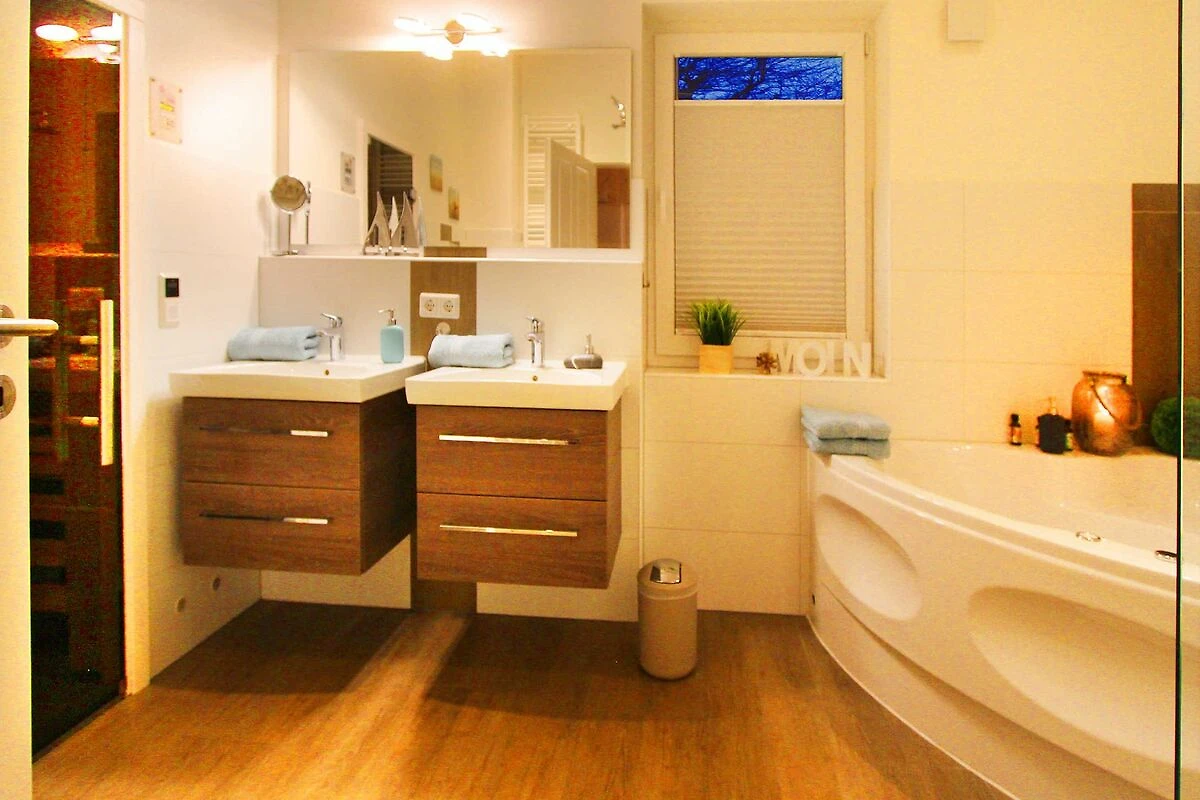 Ein Bad mit Whirlpool, ein weiteres Duschbad sowie die hauseigene Sauna sorgen für wohligen Wellness, ganz besonders in den kalten Jahreszeiten.