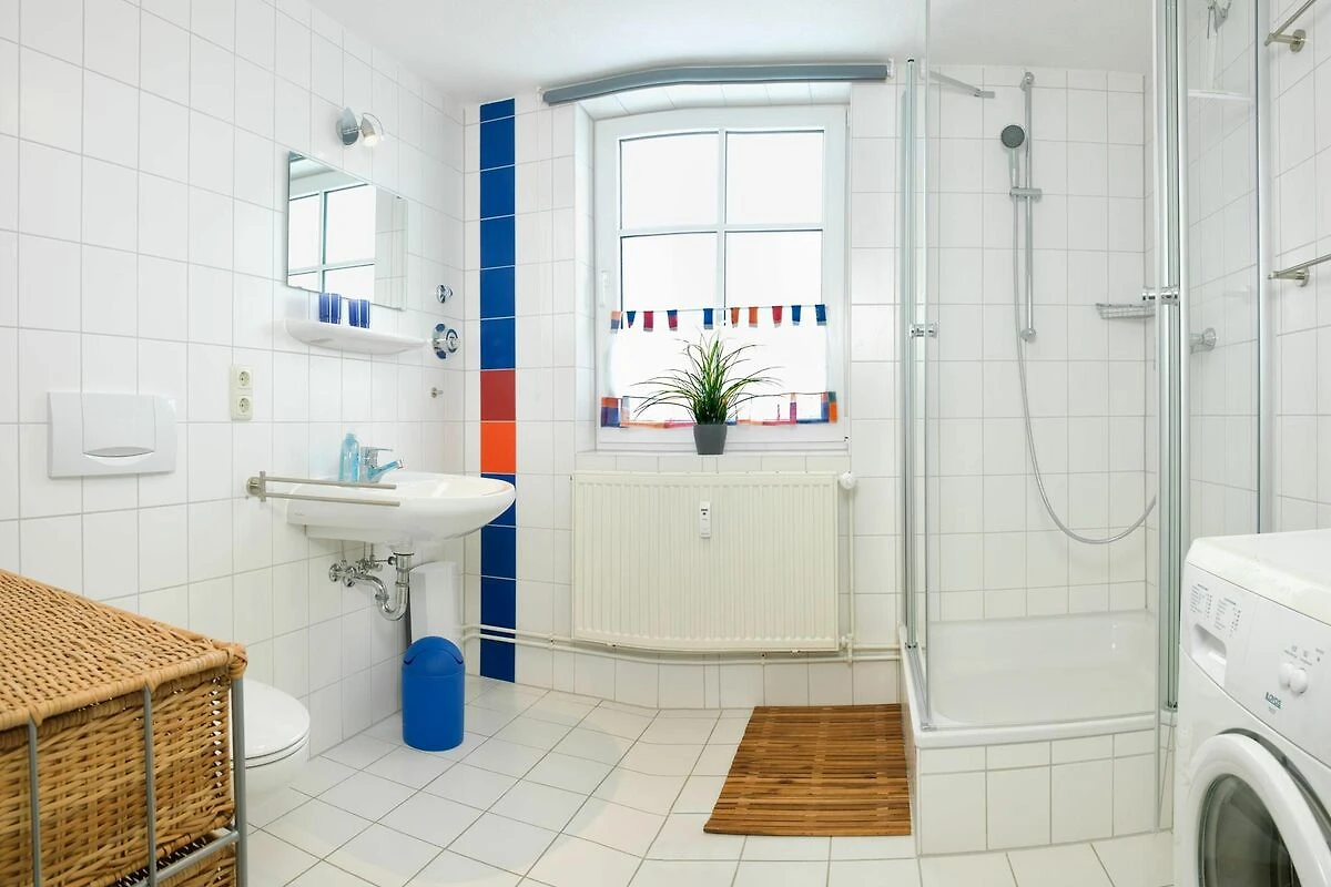 Das Bad ist mit Dusche/WC sowie einer Waschmaschine ausgestattet.