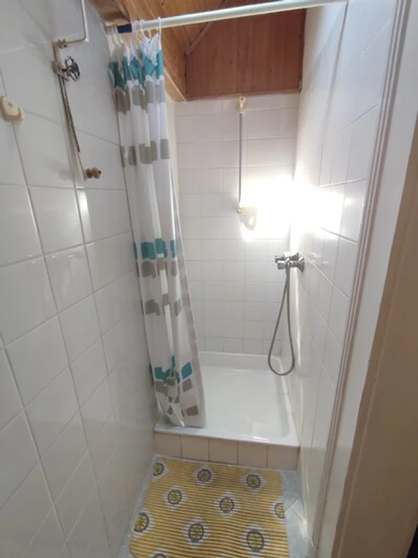 Dachgeschoss: Kochecke (8 qm) mit Elektroherd (2 Platten), Kühlschrank (200 l, Eisfach), Mikrowelle und elektrischem Wasserkocher. Bad (2 qm) mit Dusche. Separates WC (1 qm) mit WC.