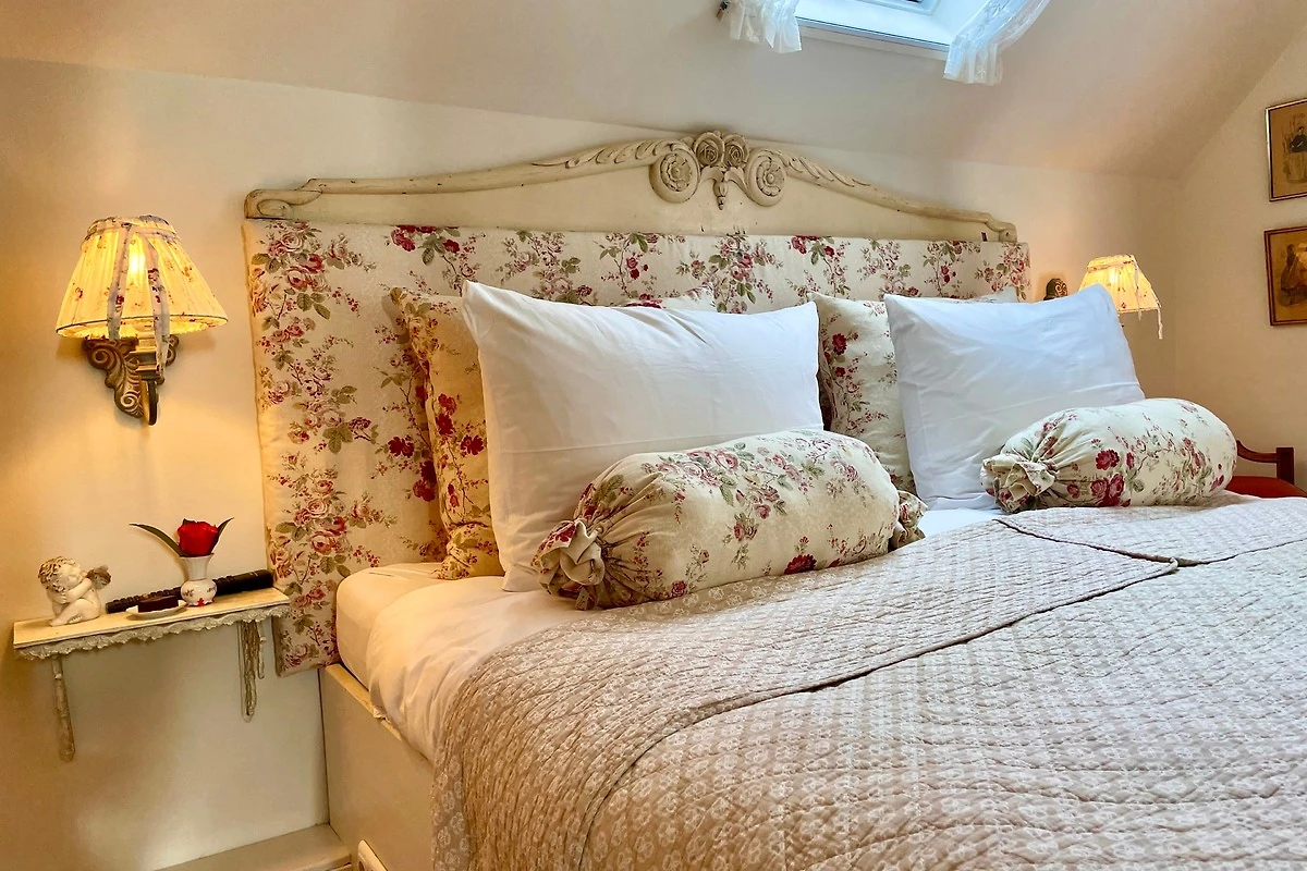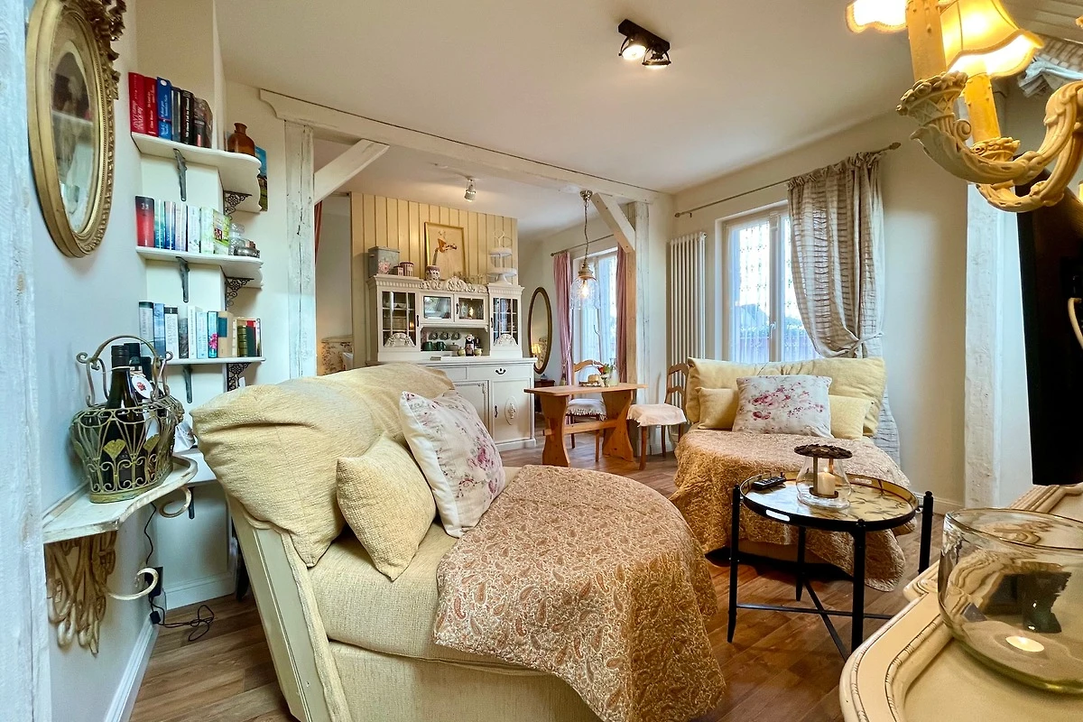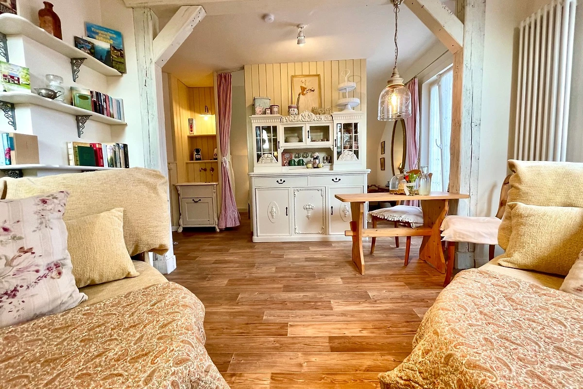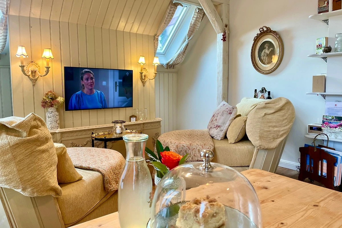 Sie befindet sich im ersten Stock der Ferienvilla und erwartet Sie mit einem gemütlichem hellen Wohnzimmer. Wie damals ist die "Gute Stube" ein Ort der Geselligkeit, der guten Gespräche, für Teezeremonien oder für ein Rendezvous mit einem Lieblingsbuch bestens gewählt. (TV im Wohnbereich) Das Rosenbuffet aus vergangenen Zeiten enthält alle Annehmlichkeiten einer kleinen Küche - Herd, Geschirrspülmaschine und Kühlschrank. Selbstverständlich sind auch hier Kaffeemaschine, Toaster und Wasserkocher arrangiert.
