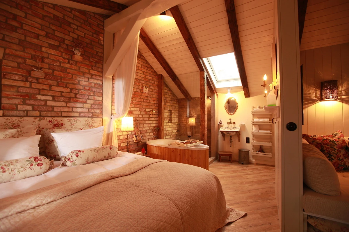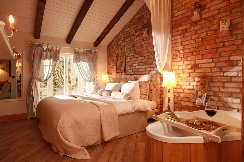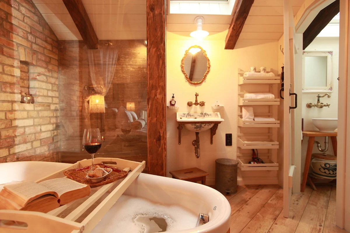 Gesamtgrösse ca. 45qm, zuzüglich ca. 8qm Balkon, kostenfreies WLAN, Kamin & Fussbodenheizung, 1 PKW Stellplatz, Nutzung des Garten SPA mit Schwimmteich, Gartensaunen & Ruhebereichen