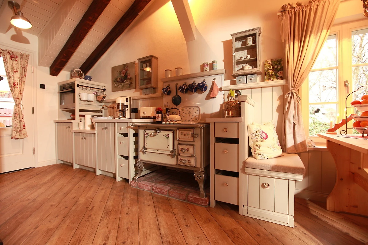 Unsere "Gartenlaube" befindet sich unter dem Dach unseres "Gartenhauses". Eine kleine Küche mit nostalgischem Küchenofen (modernisiert mit Induktion) lädt zum Brutzeln und Kochen ein. In der gemütlichen Kamin-Lounge mit TV und grosser Kuschelecke kann man nicht nur an kalten Wintertagen die Zeit vergessen...