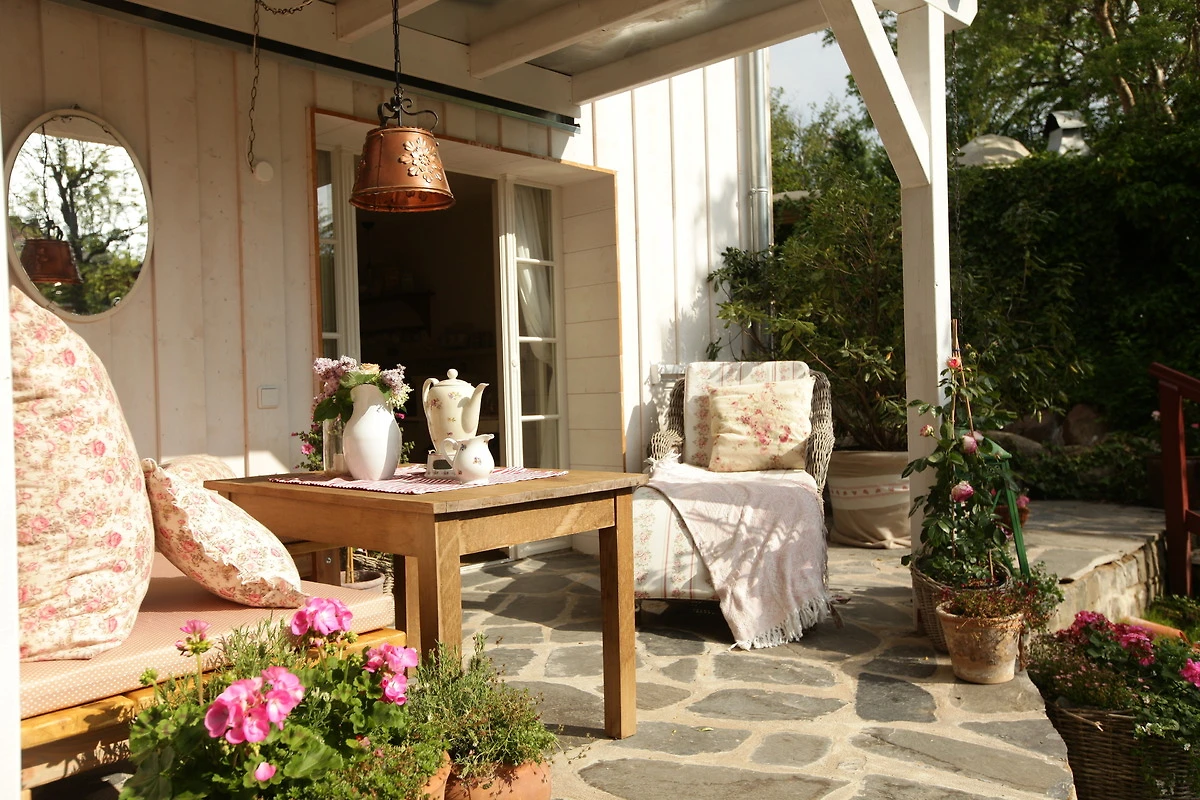 Ein besonders "Schmankerl" die sonnige Terrasse am plätschernden Bachlauf mit Blick über den Schwimmteich, welche zum Frühstück oder Abendessen im Garten einlädt.