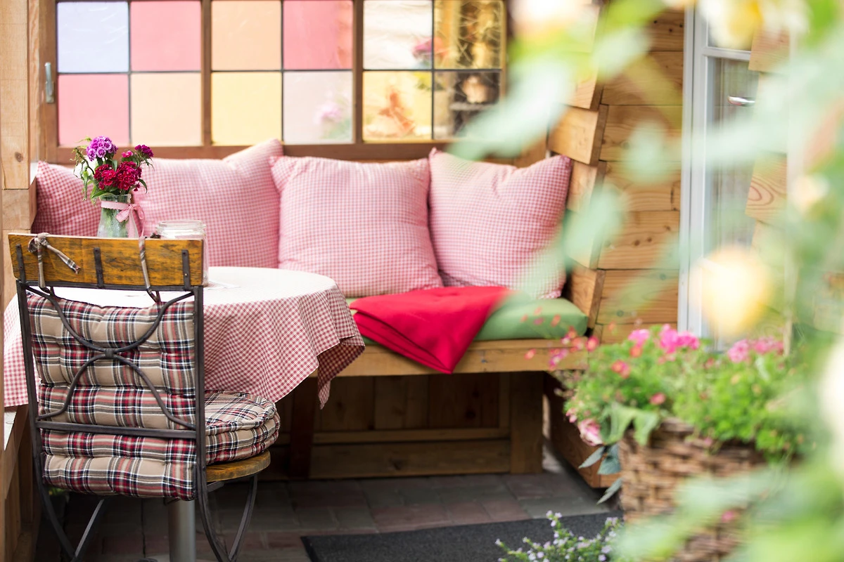 Im Herzstück unseres Gartens - zwischen Apfelbäumen und Hortensien eingebettet liegt der "Apfeltraum". Zwei Licht-durchflutete Sonnenterrassen laden zum Frühstück, Grillen oder zum Lesen ein.