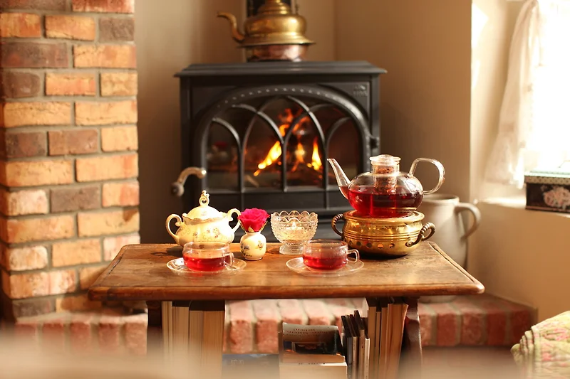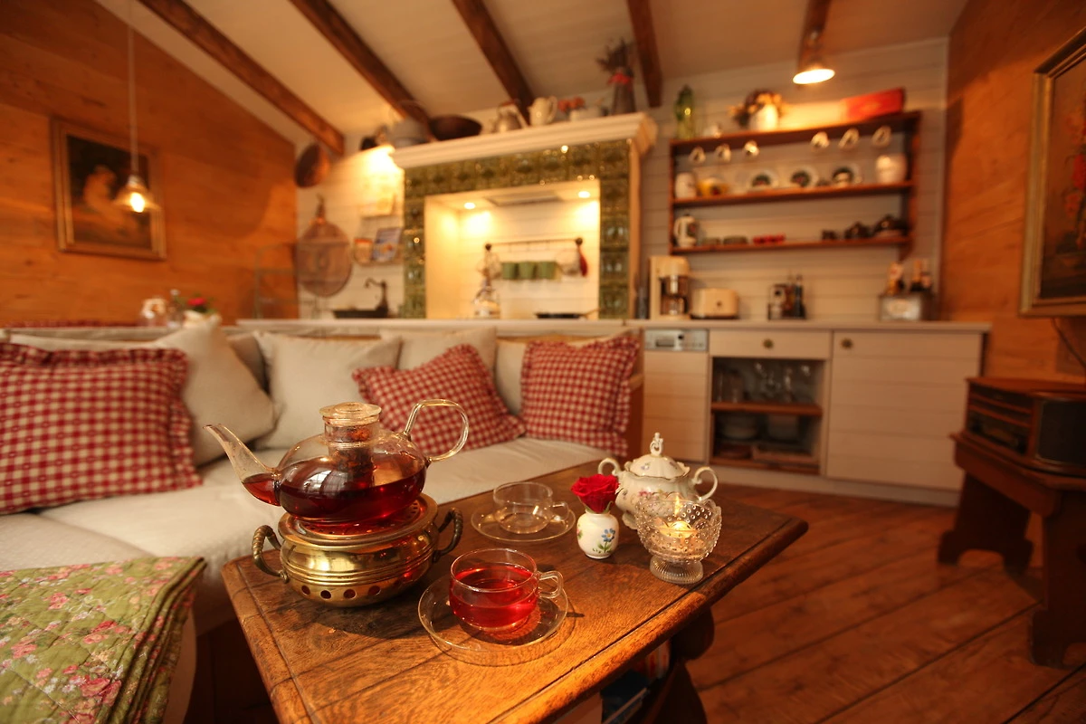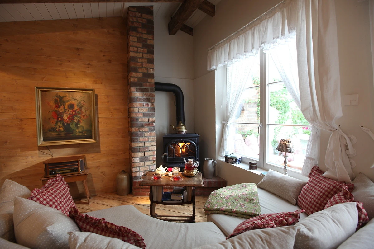Das Innere der "Kräuterstube" ist Gemütlichkeit pur. Hier können Sie sich im Wohnbereich mit grossem runden Kuschelsofa direkt vor dem knisterndem Holzofenkamin zurückziehen. (TV gehören auch hier zur Ausstattung)