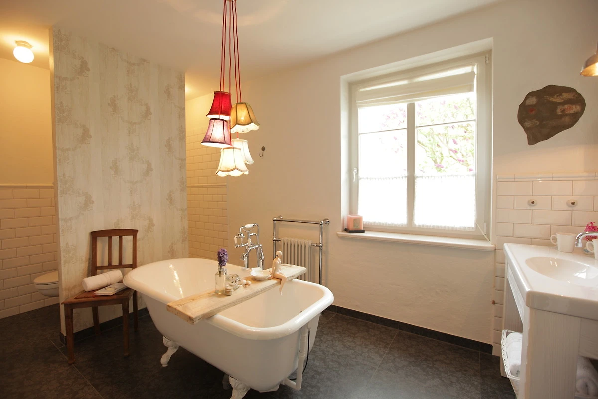 Das Badezimmer ist mit freistehender Badewanne, Dusche, WC und Fussbodenheizung ausgestattet.