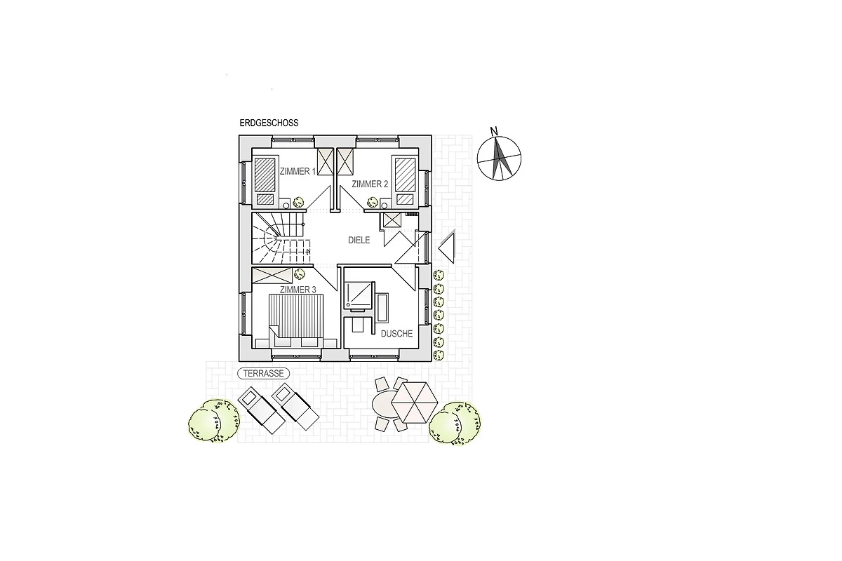 Vom Obergeschoss führt eine Aussentreppe direkt in den ruhigen Garten. Hier können entspannt die Füsse hochgelegt werden oder Spiele auf dem Rasen für Abwechslung sorgen. Auf der Terrasse stehen Gartenmöbel sowie zwei Sonnenliegen, ein Sonnenschirm und ein Kohlegrill bereit um den Tag genüsslich ausklingen zu lassen.