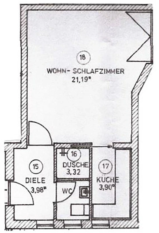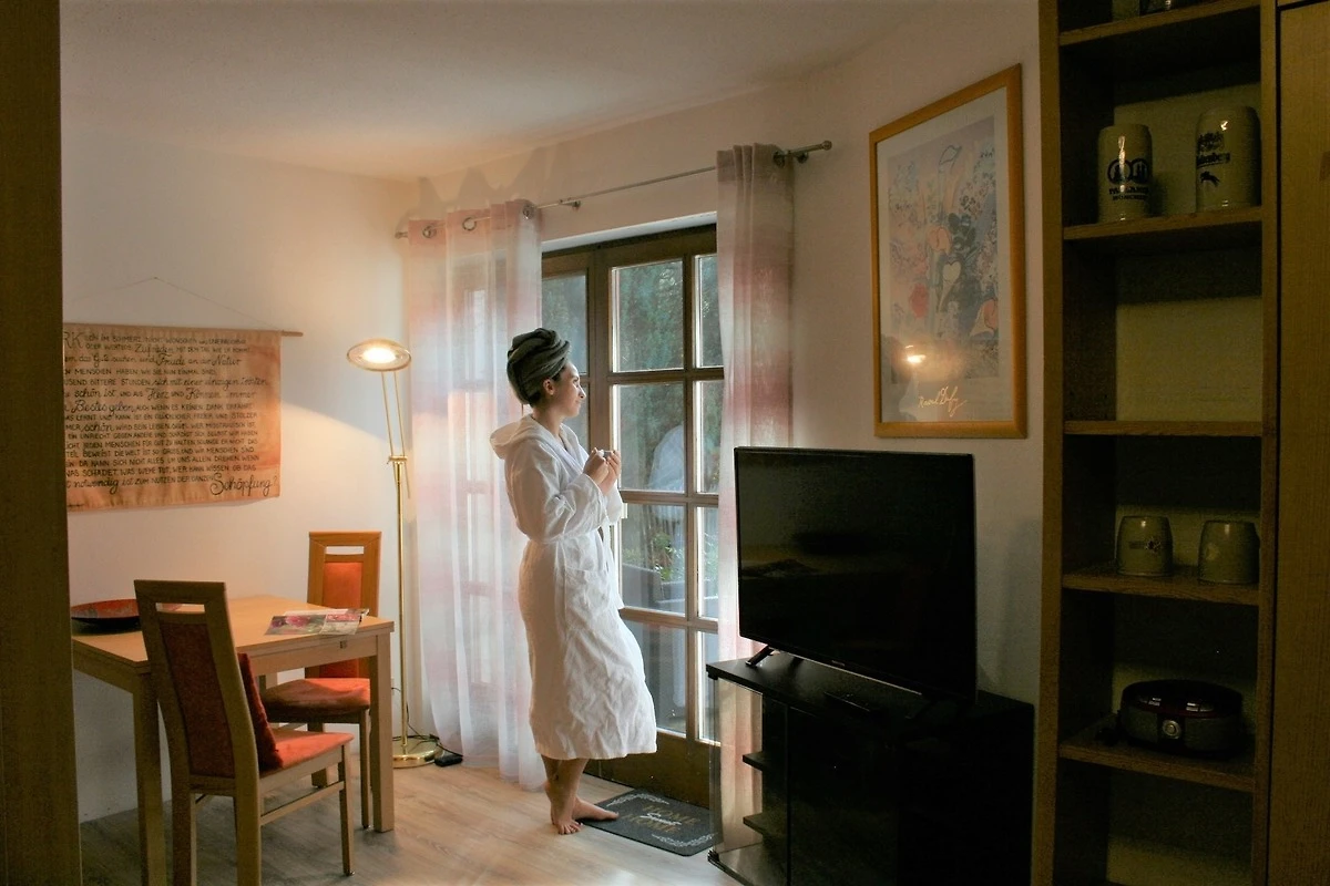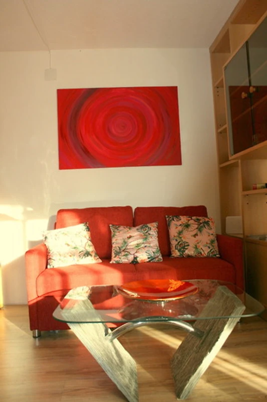 Im Wohn-/Schlafraum befindet sich das bequeme 1,20 m breite Bett, abgetrennt durch einen Raumteiler vom Bereich mit Sofa, Esstisch und TV-Gerät. Zudem steht ein ausziehbares Schlafsofa (160 x 200) zur Verfügung.