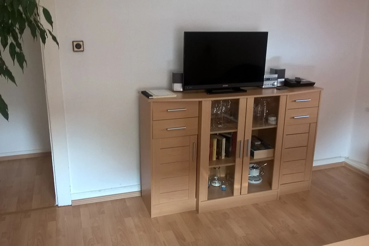 Im Wohnzimmer finden Sie einen Fernseher, Blurayplayer, DVD, Radio Und CD Minianlage, ein 2 Sitz und ein 3 Sitz Sofa und einen Sessel, Telefon und WLAN