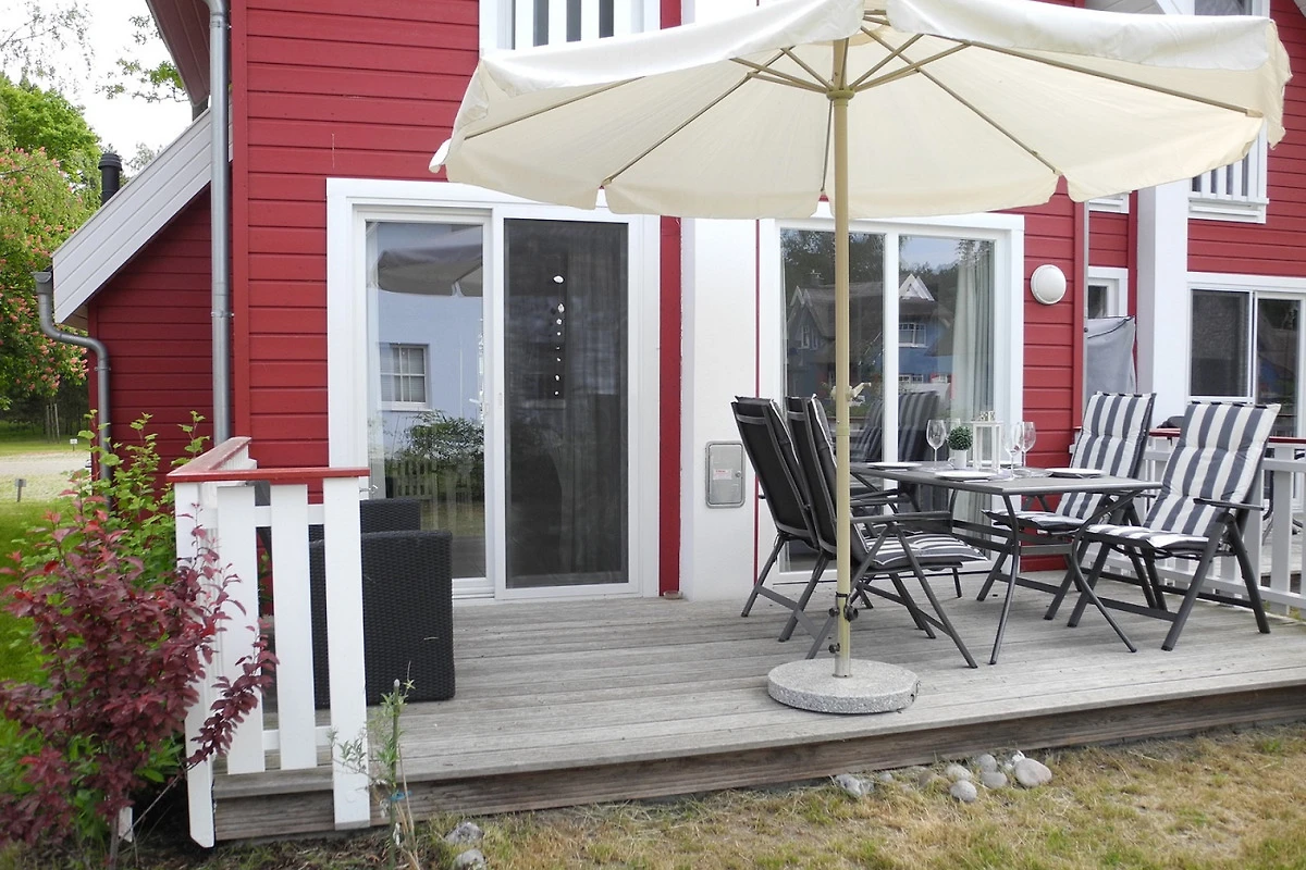 Auf der grossen Terrasse finden Sie Terrassenmöbel und einen grossen Sonnenschirm.