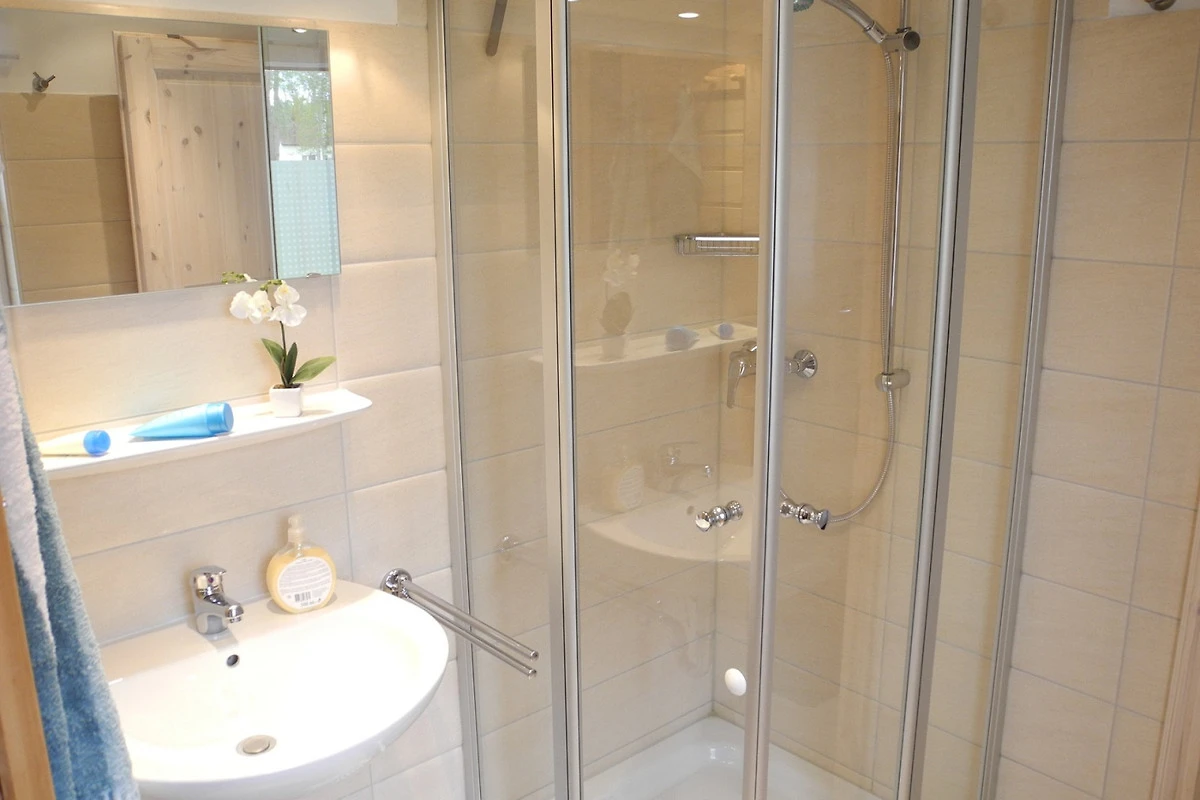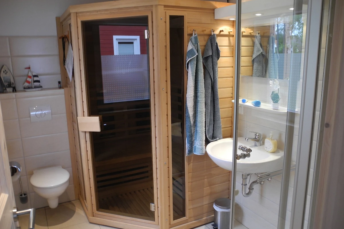 Ebenfalls im EG befindet sich ein Bad mit WC, Dusche und Infrarotsauna. Alle Räume im EG haben Fussbodenheizung.