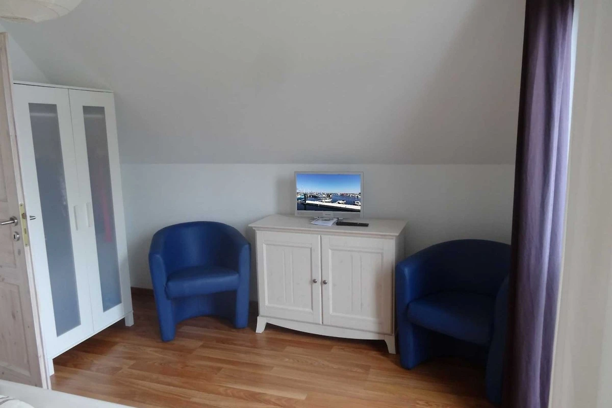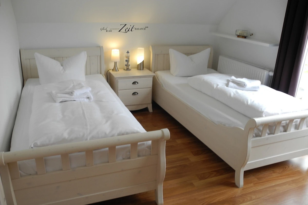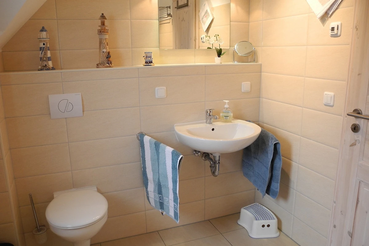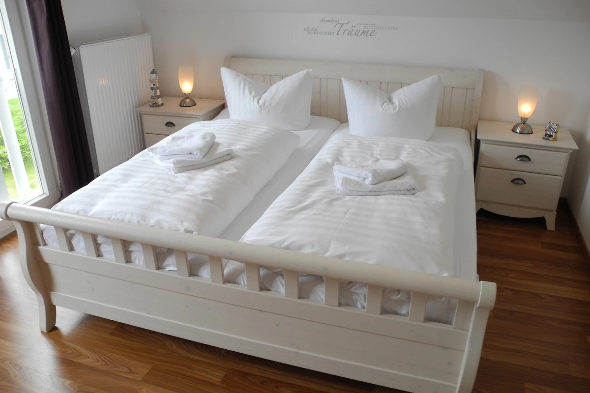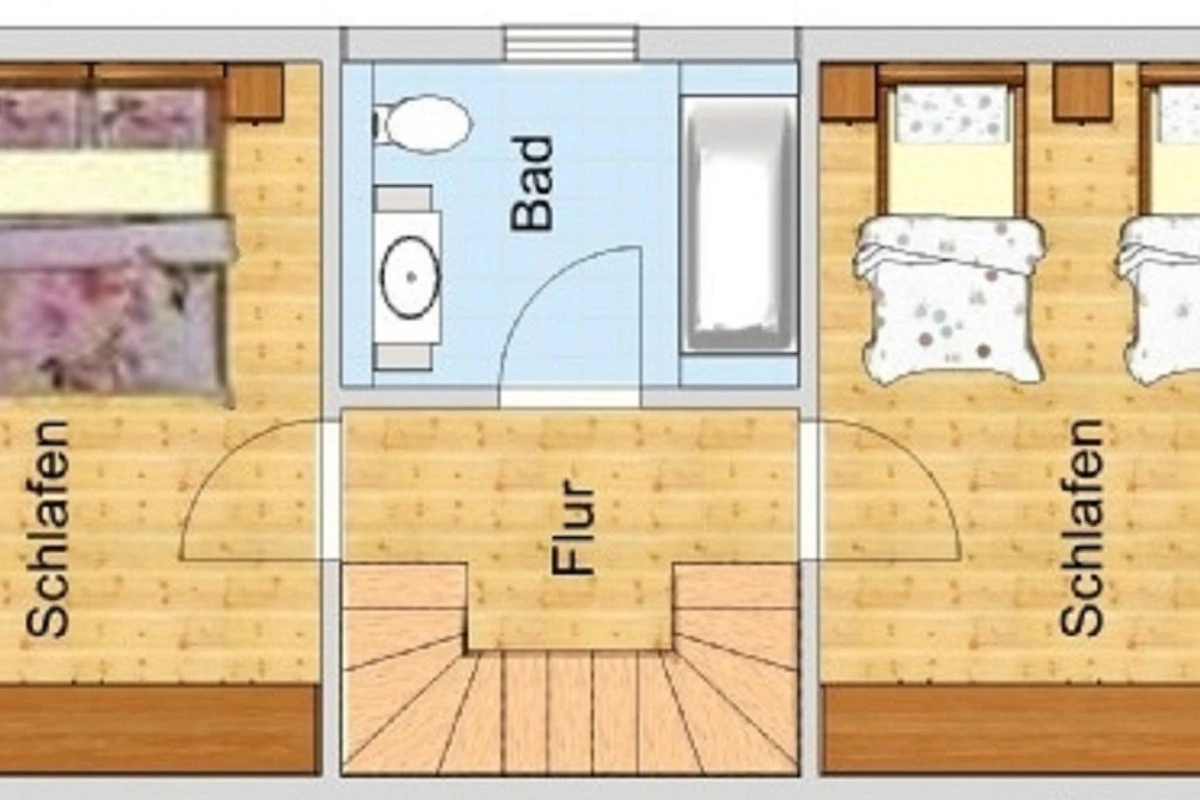 Im Obergeschoss sind zwei geräumige Schlafräume für 4 Personen und einem Baby oder Kleinkind. Das Bad ist ausgestattet mit einem Whirlpool.