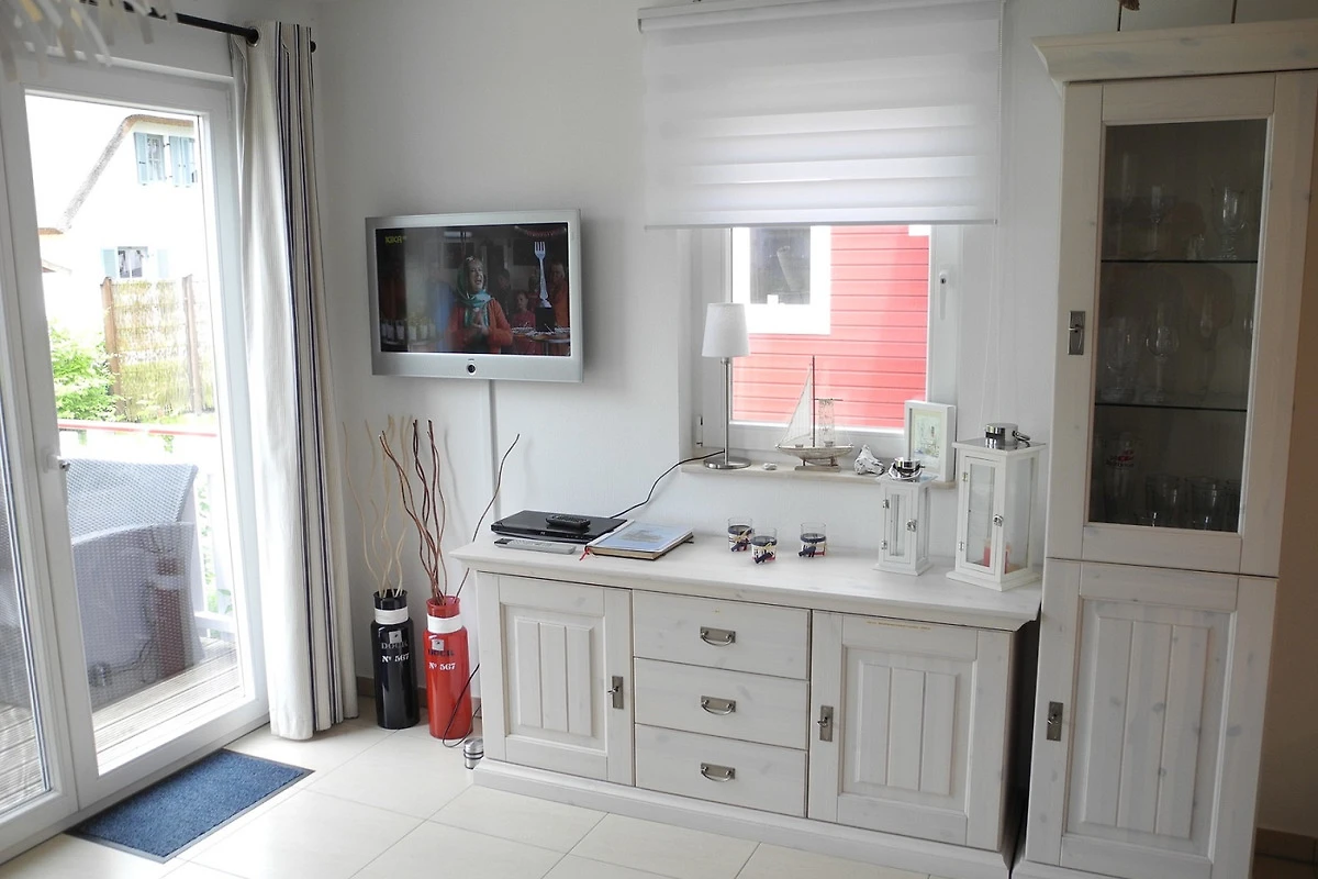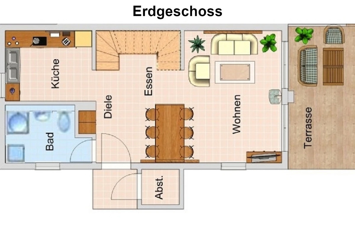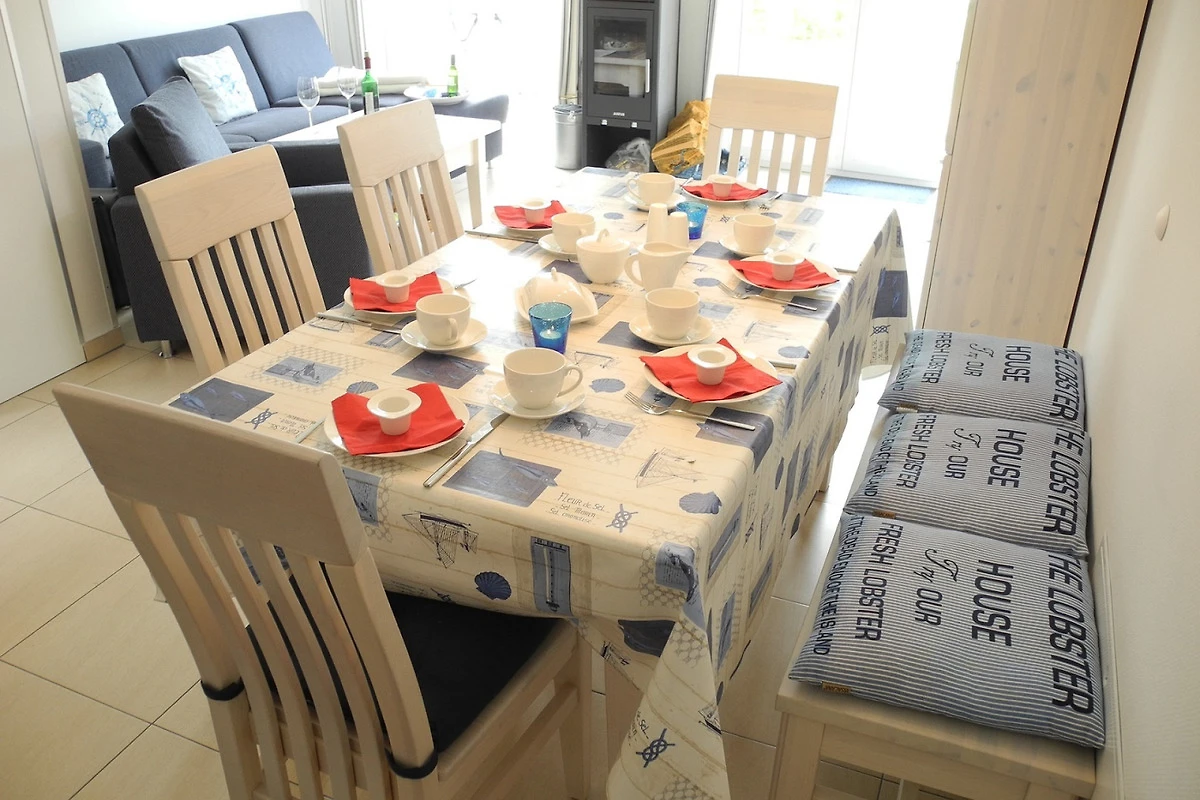 Im Erdgeschoss befindet sich der helle Wohnbereich mit Sitzecke inkl. Schlafsofa, ein Kaminofen, ein Smart-TV, ein grosszügiger Essbereich und eine voll ausgestattete Küche.
