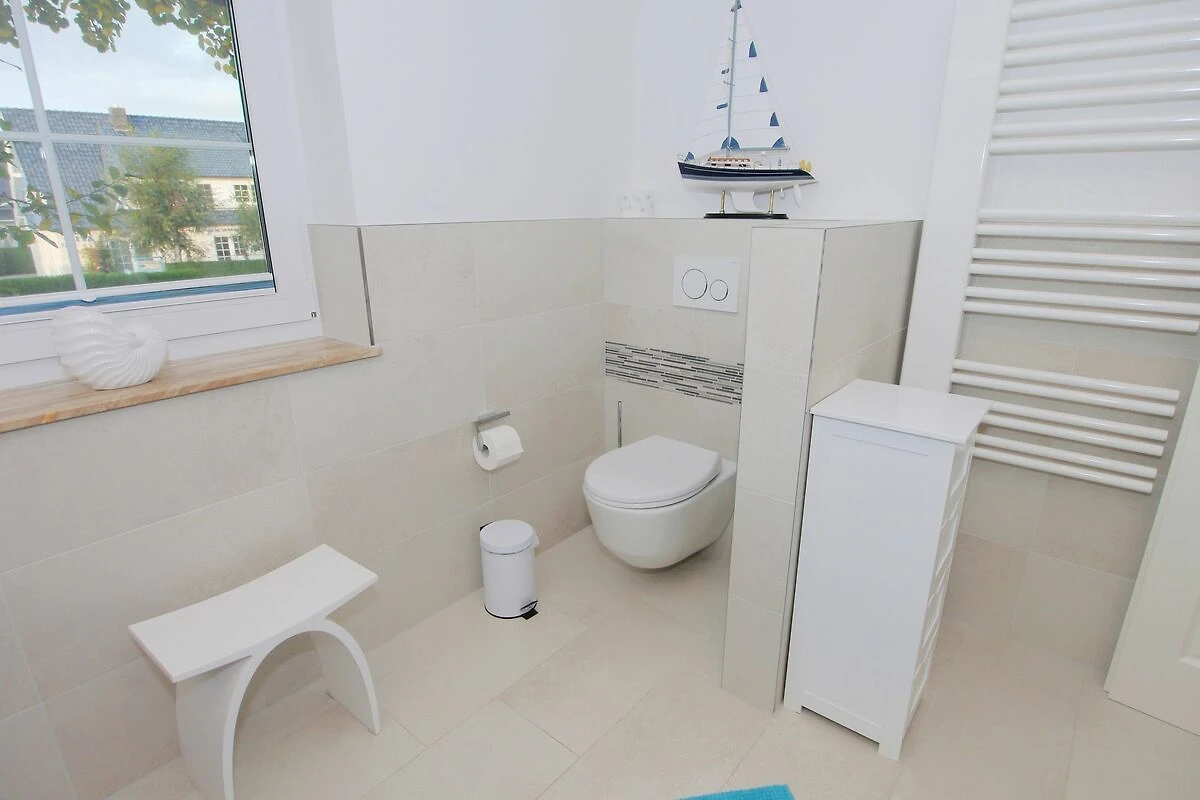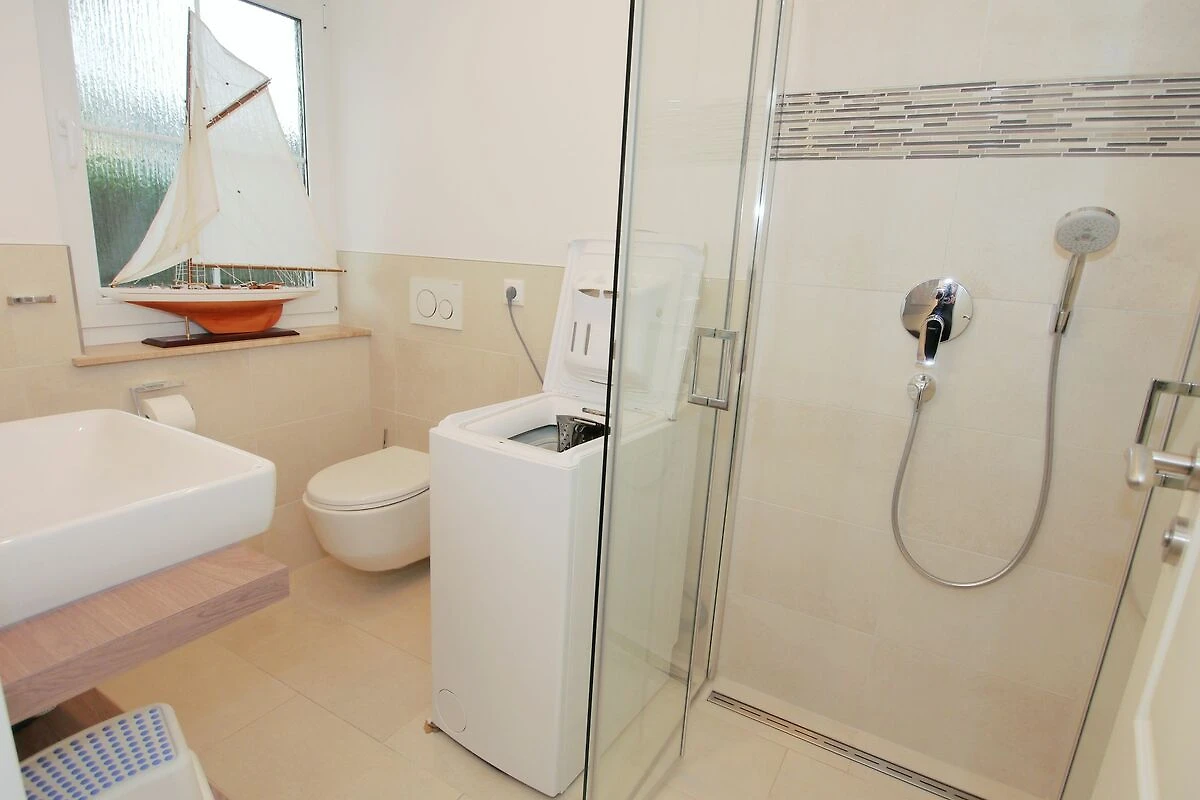Das kleinere Badezimmer mit ebenerdiger Dusche und die Waschmaschine sind ebenfalls hier zu finden.