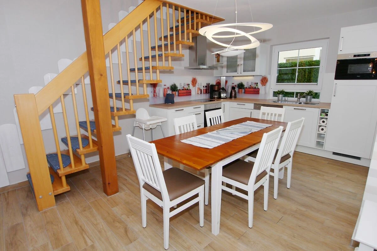 Im Erdgeschoss befindet sich der großzügige Wohnbereich mit der Essecke die direkt in die Küche übergeht, hier befindet sich auch der Zugang zur halbüberdachten Süd-Westterrasse.