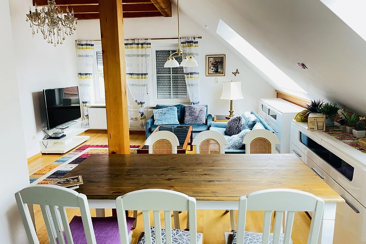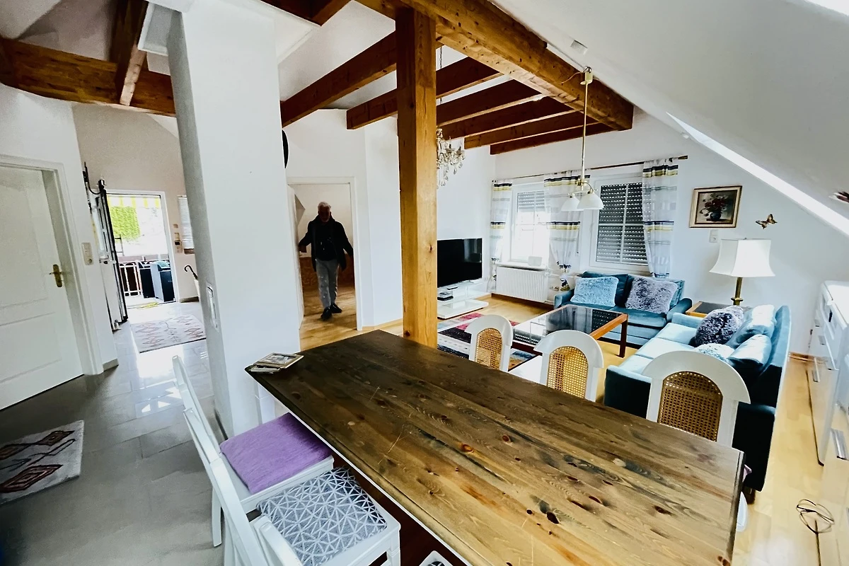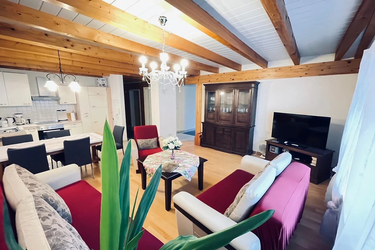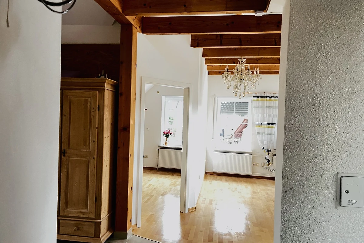 Rustikale Mansarden-Wohnung, Holzbalkendecke ,Parkettfußboden,grosses Bad mit Wanne und Dusche, Fußbodenheizung , Gäste WC, 2 x 2 Bettzimmer , 1x 1 Bettzimmer,