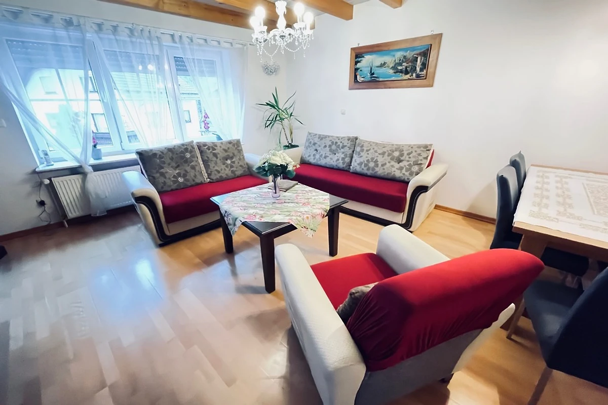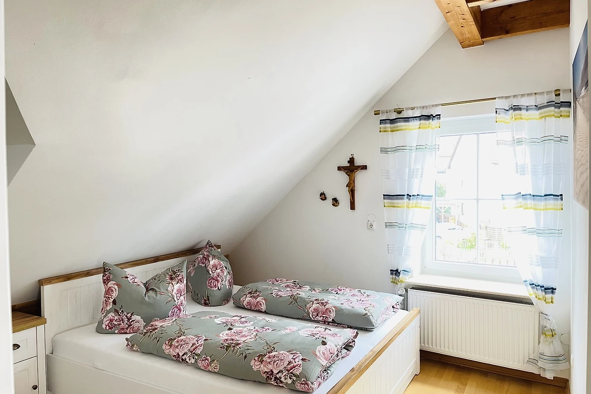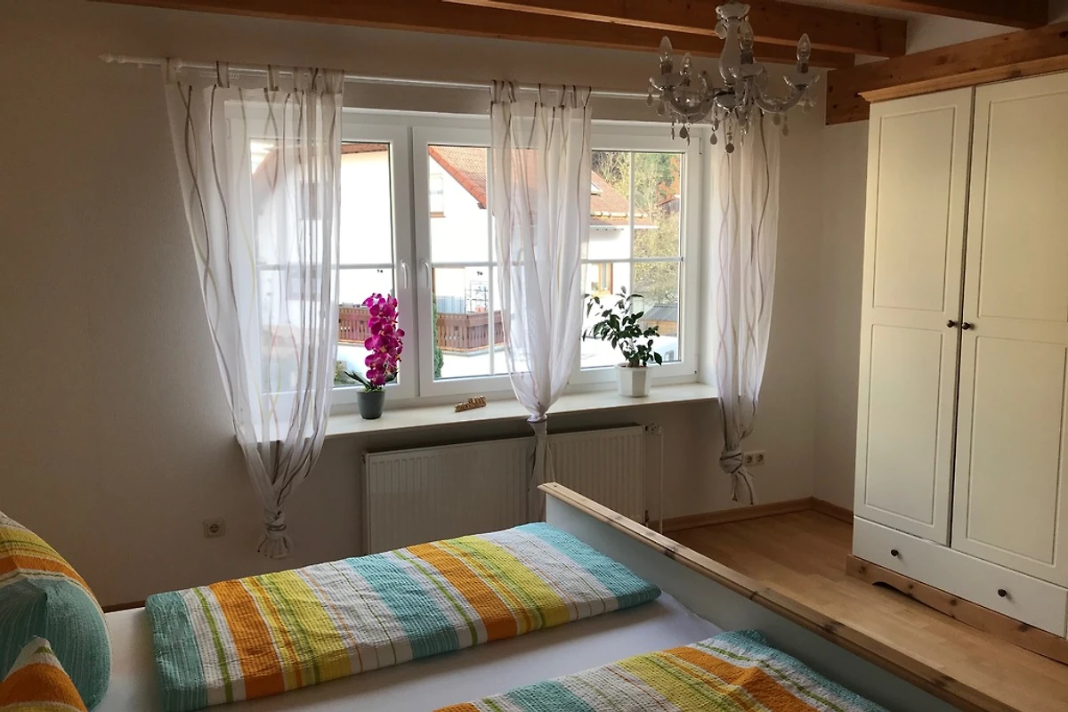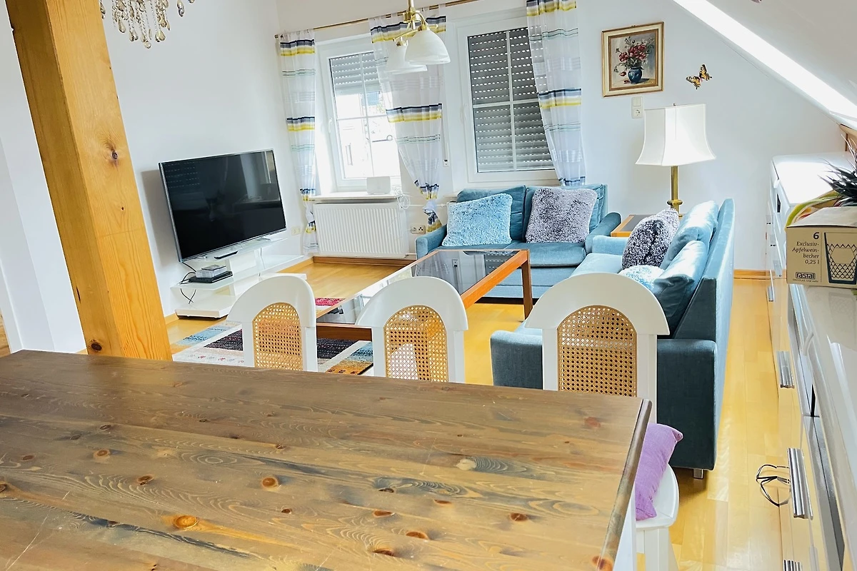 Rustikale Mansarden-Wohnung, Holzbalkendecke ,Parkettfußboden,grosses Bad mit Wanne und Dusche, Fußbodenheizung , Gäste WC, 2 x 2 Bettzimmer , 1x 1 Bettzimmer,