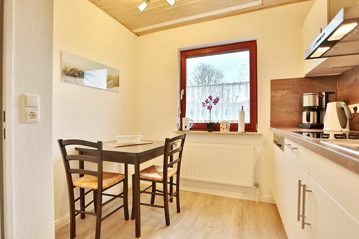 Die räumlich getrennte Küche bietet ein Ceran-Kochfeld, Geschirrspüler, Mikrowellen-Backofen-Kombigerät, Kühlschrank mit Gefrierfach und einen Esstisch für 2 Personen.