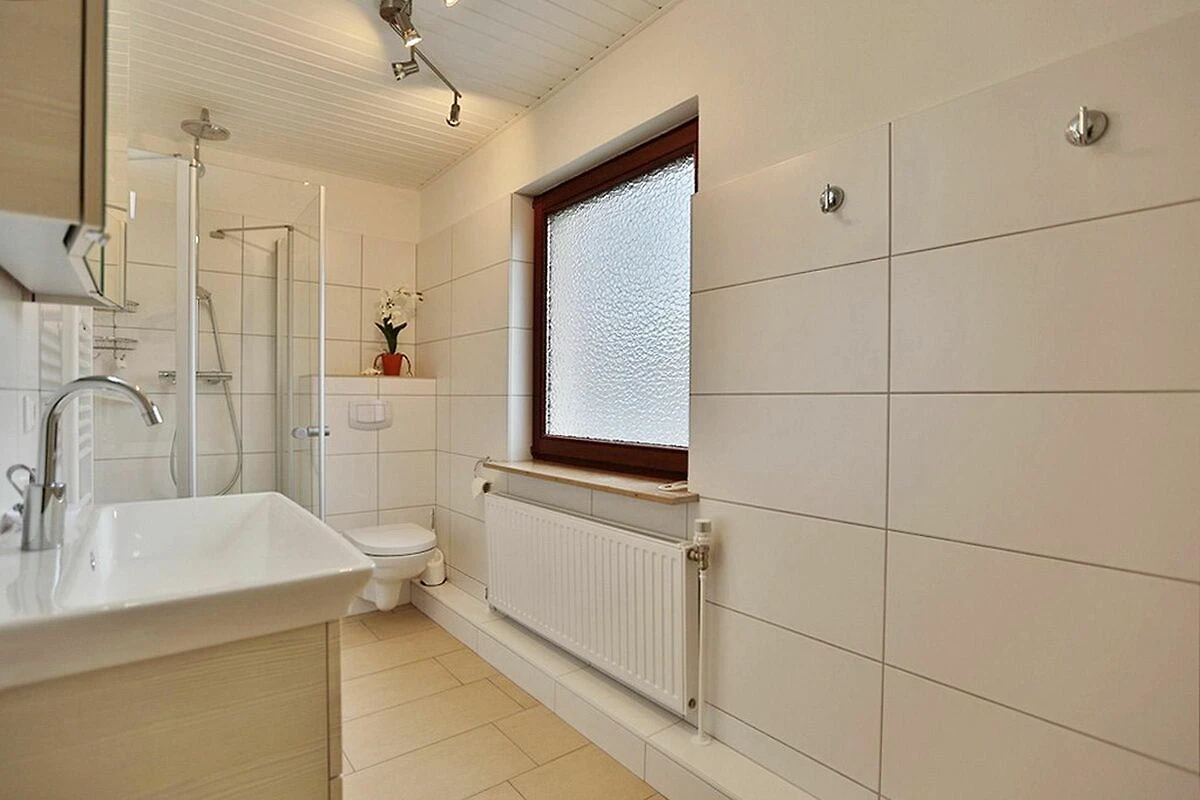 Vom Elternschlafzimmer gelangen Sie in das ebenerdige Duschbad, mit Haartrockner und Fenster.
