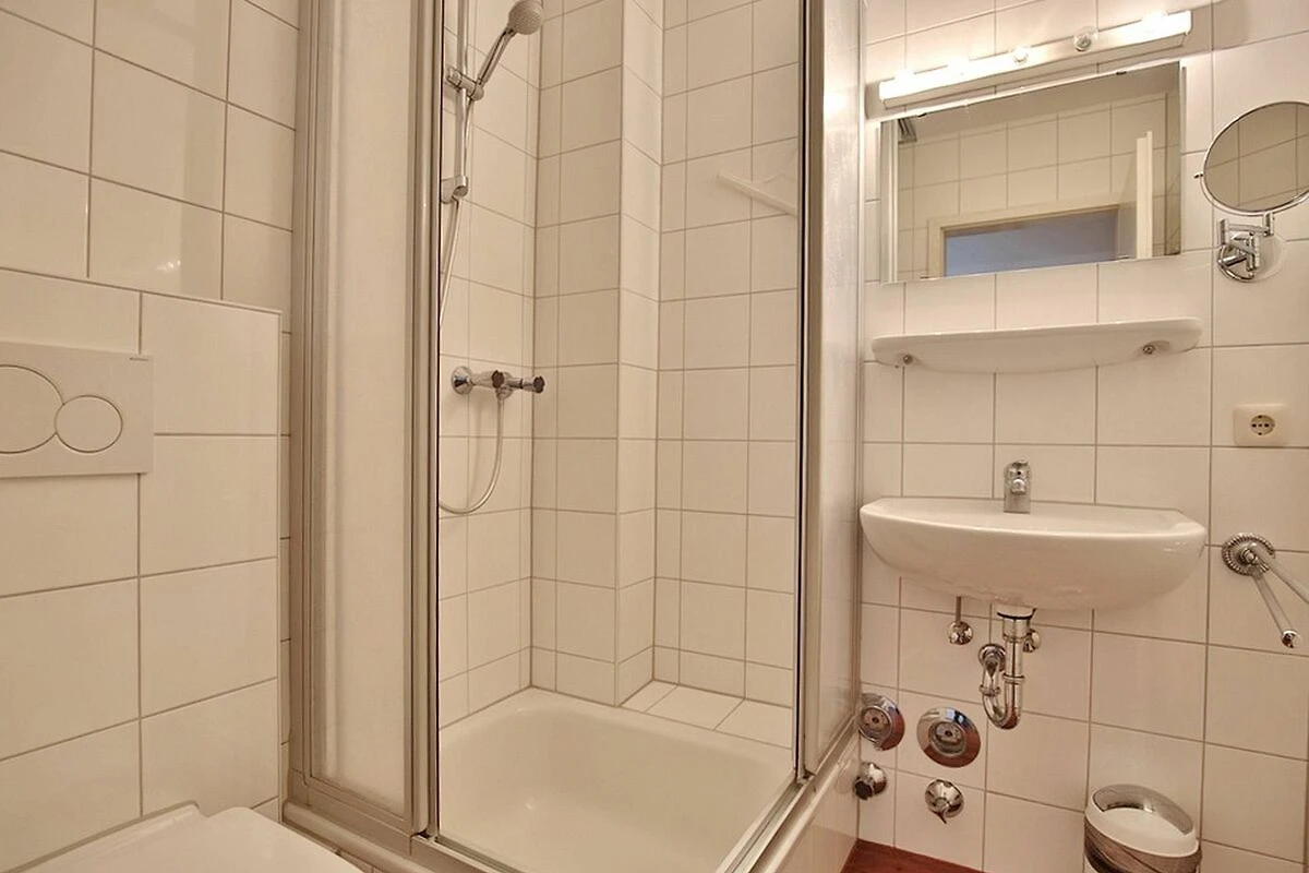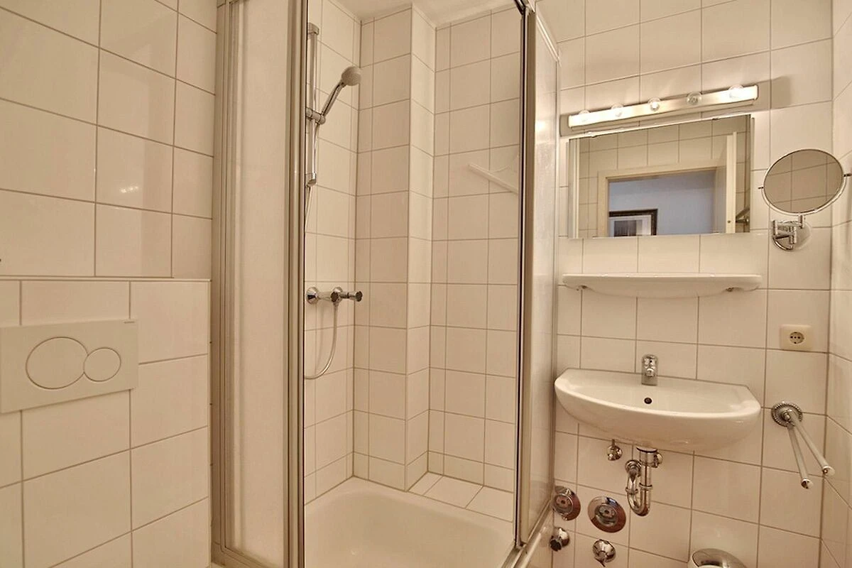 Das Appartement ist mit einem Duschbad ausgestattet (kleine Erhöhung beim Einstieg der Dusche), ein Kosmetikspiegel ist ebenso im Badezimmer vorzufinden.