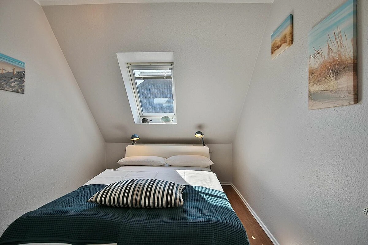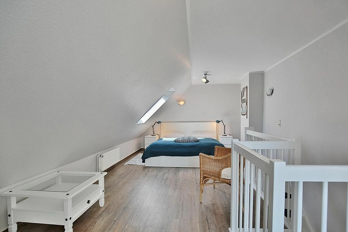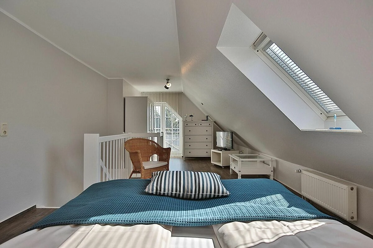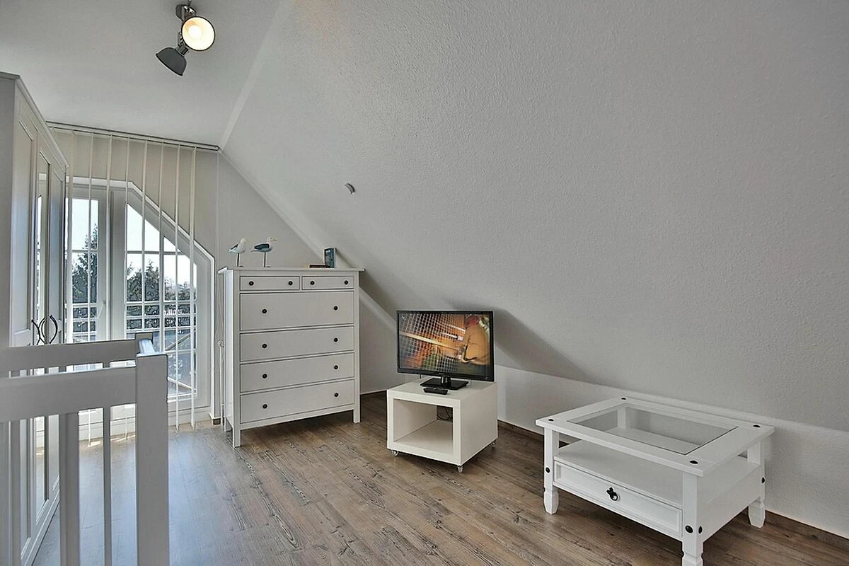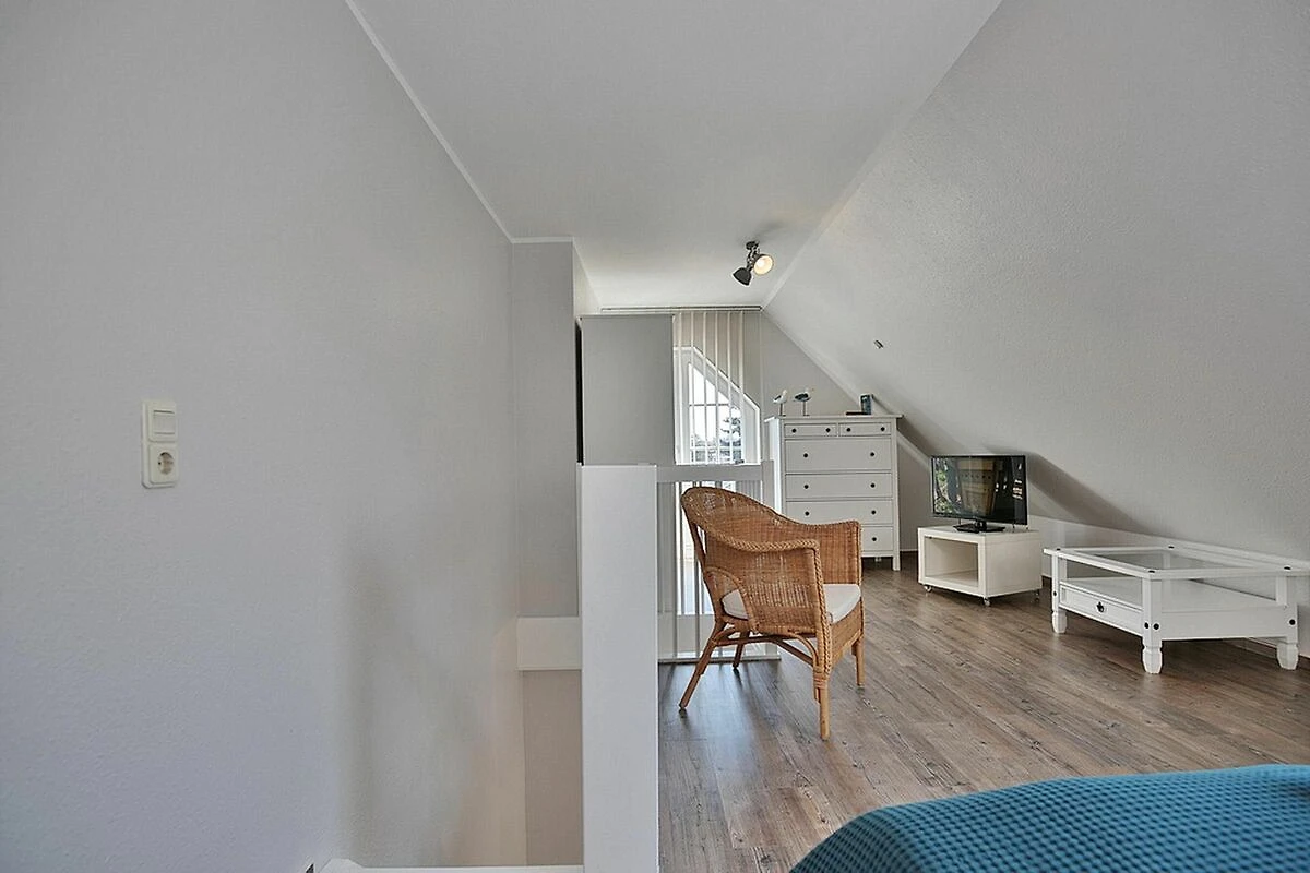 Vom Wohnzimmer gelangen Sie über die Treppe zu einer offenen Empore, die über ein Doppelbett, einen Kleiderschrank und einen weiteren TV mit DVD-Player verfügt.