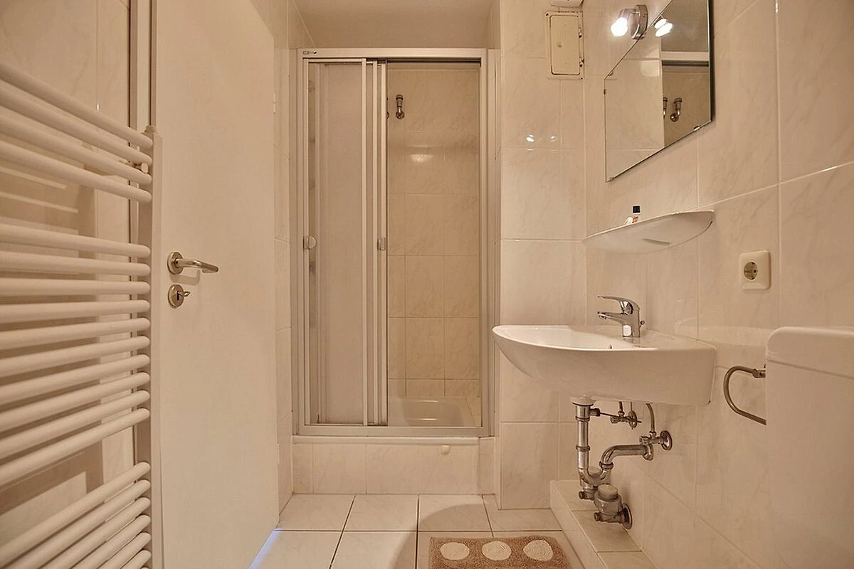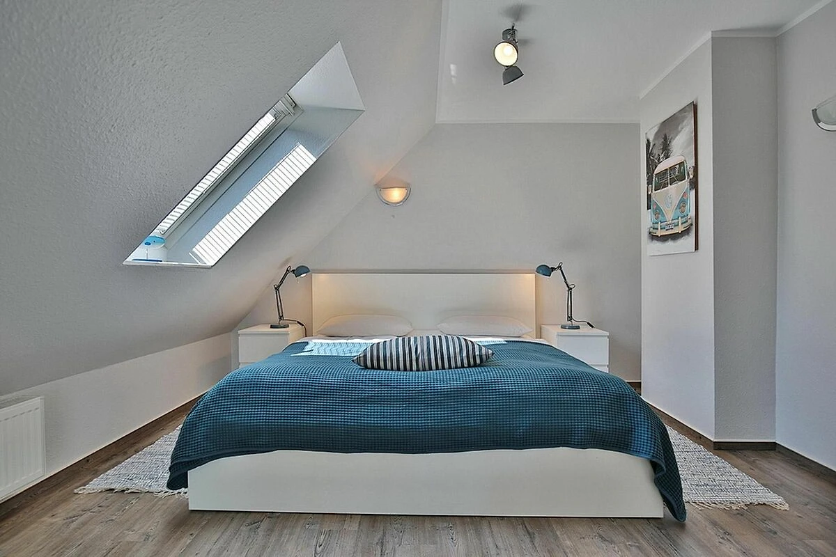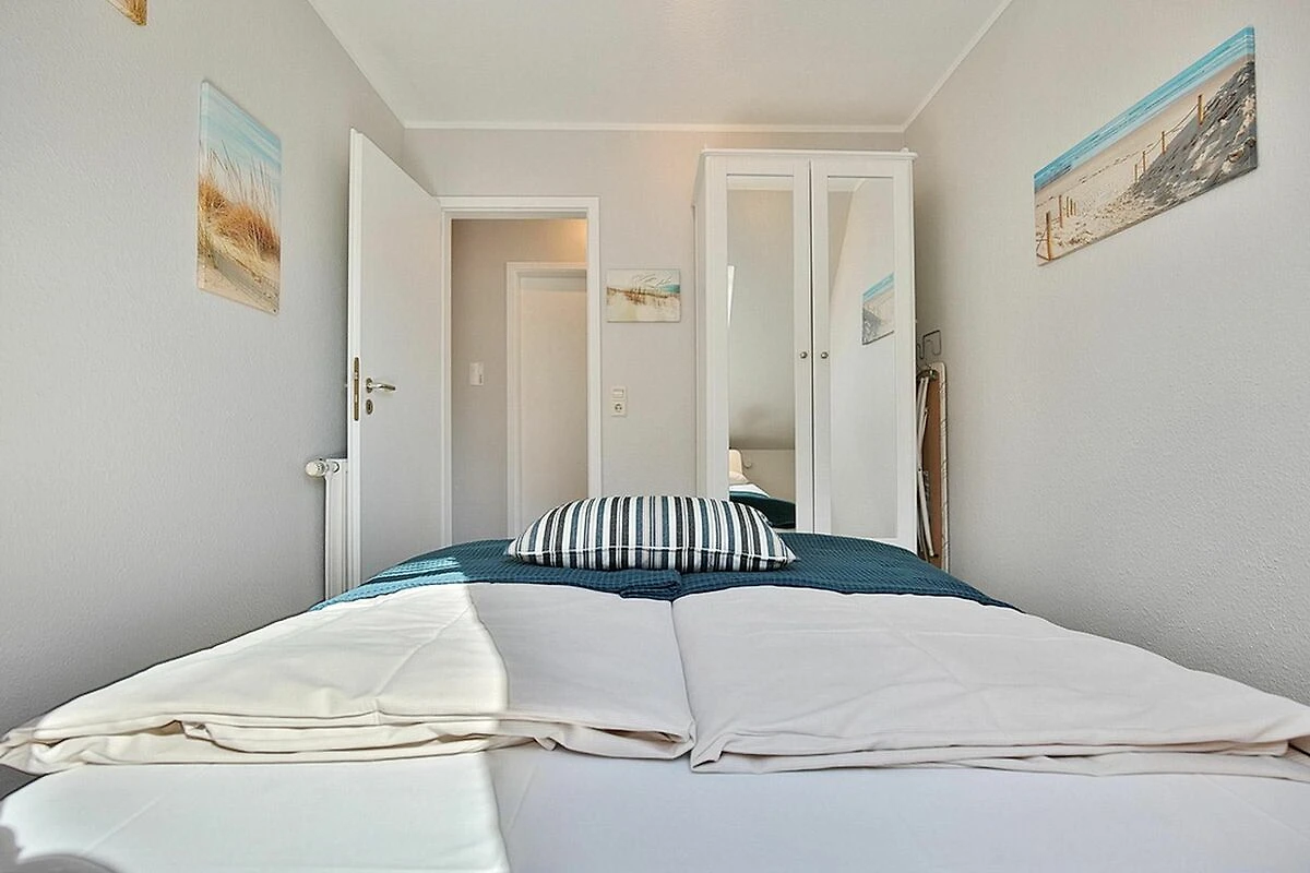Das Schlafzimmer mit einem Französischen Doppelbett (140x200cm) und einem Kleiderschrank erreichen Sie über den Flur.