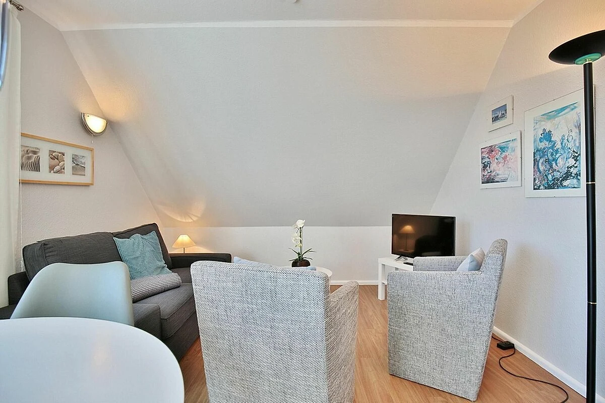 In diesem Appartement erwartet Sie ein Wohnraum mit einer gemütlichen Couch, ein Flachbild-Kabel-TV mit DVD-Player und Videorecorder.