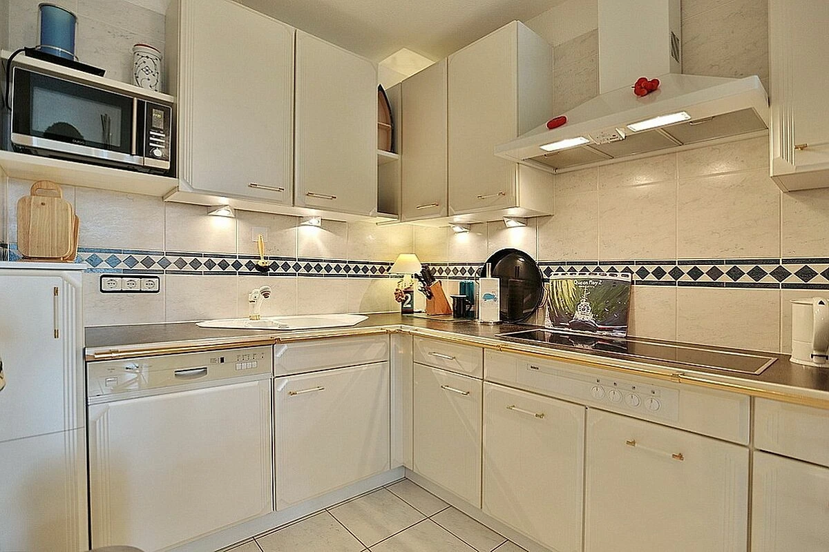 Die separierte Küchenzeile ist mit Ceranfeld, Spülmaschine und Mikrowelle und Essbereich ausgestattet.