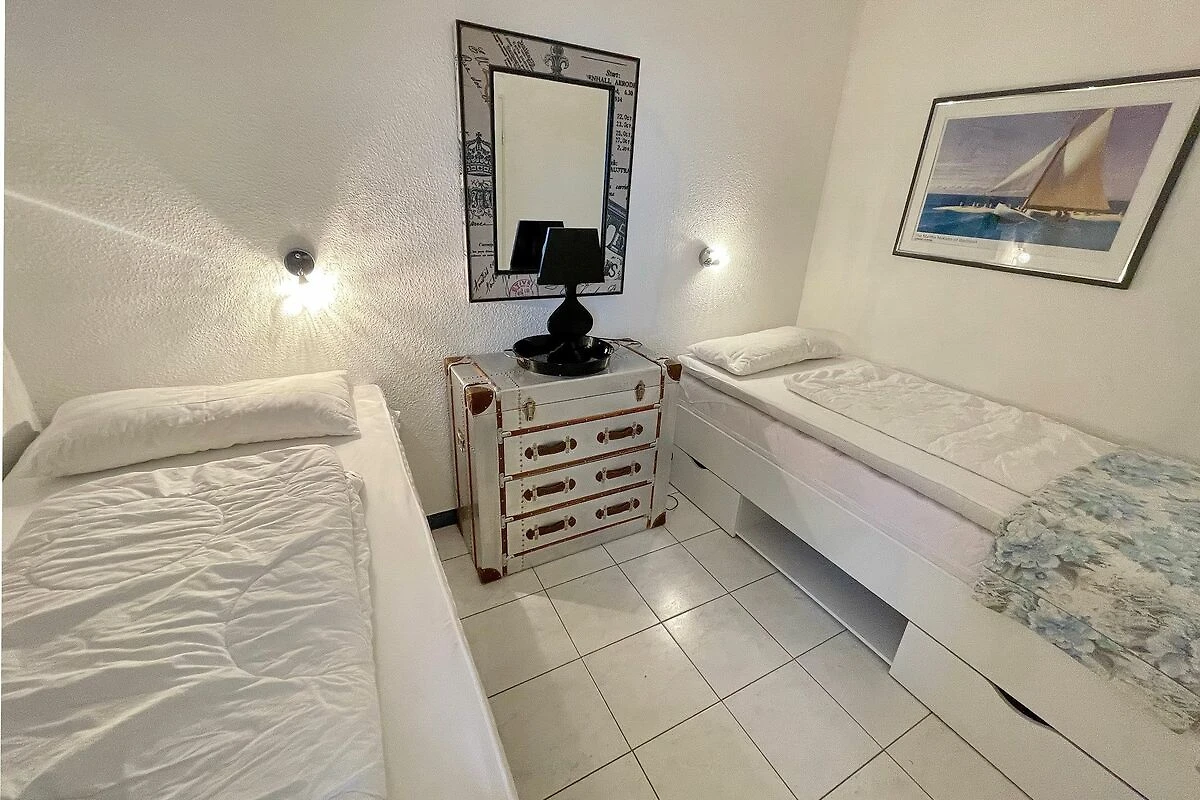 Das separate Schlafzimmer ist mit 2 Einzelbetten ideal für Kinder eingerichtet, ein Kinderhochstuhl gehört ebenfalls zur Ausstattung.
