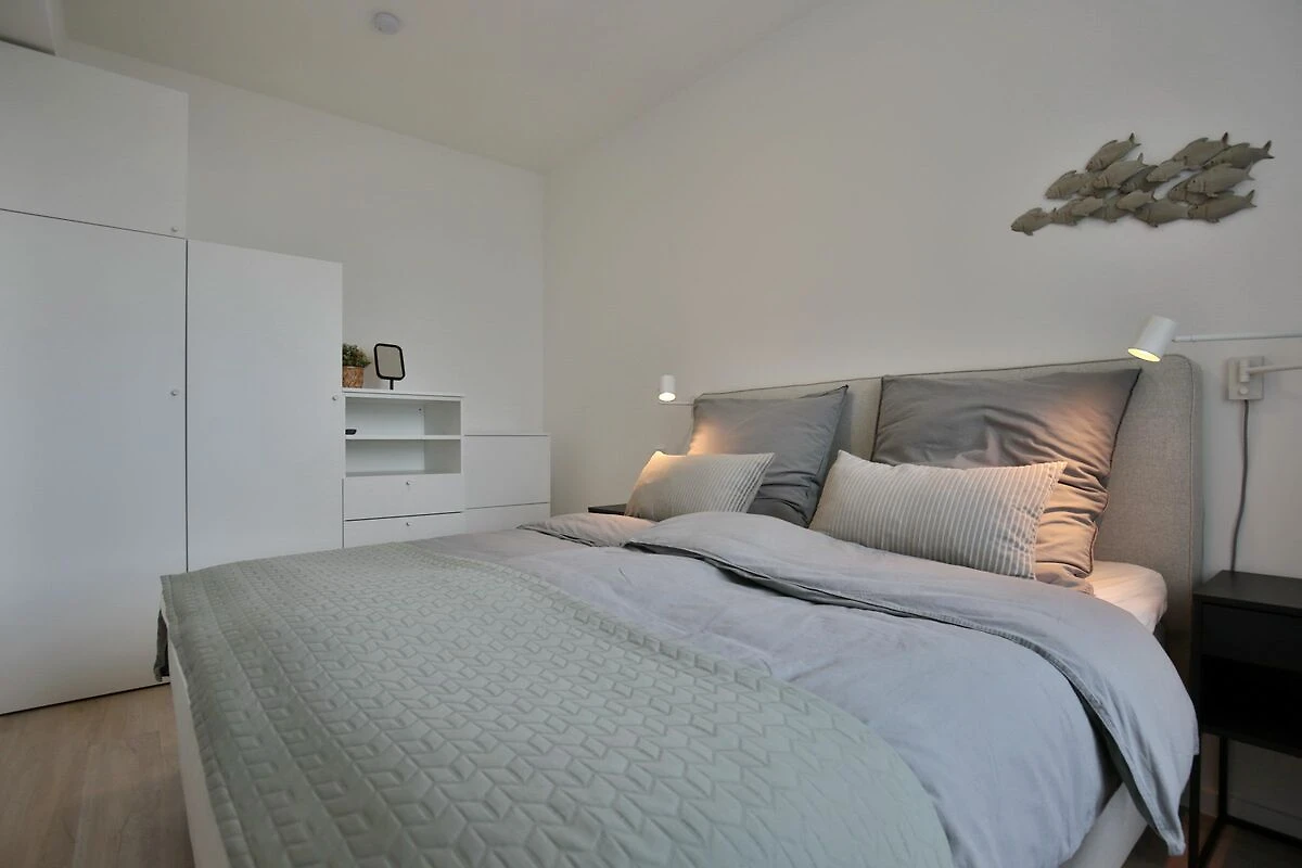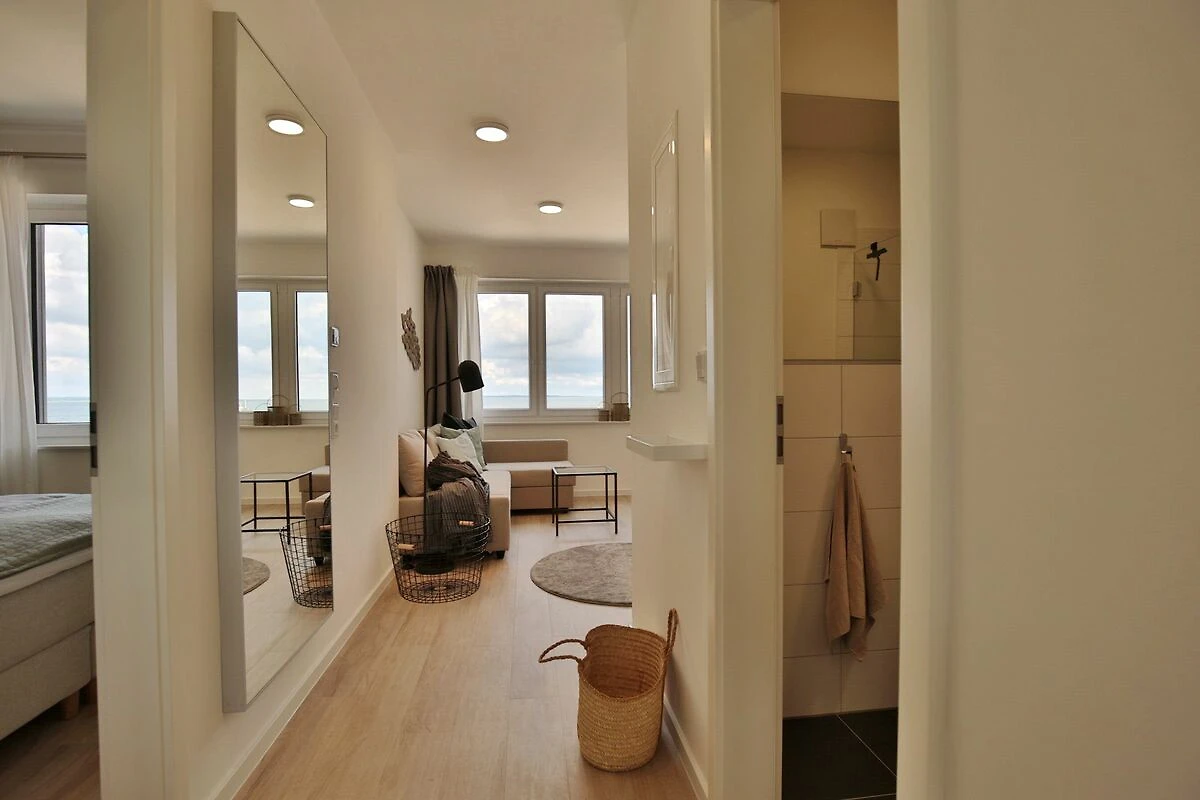 Ausgehend vom Wohnungsflur gelangen Sie in das Schlafzimmer, welches mit einem Boxspringbett, einer Kommode, ausreichend Stauraum für Ihre Kleidung und einem Fernsehgerät ausgestattet ist. Auch von hier aus sehen Sie die Weiten des Meeres.