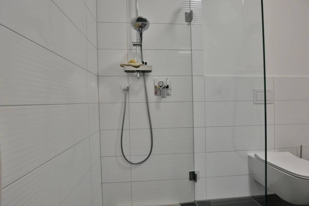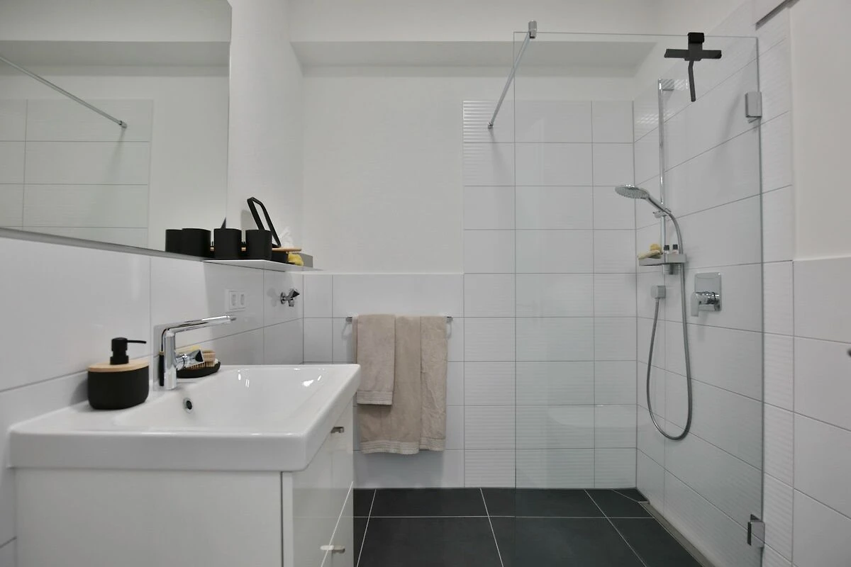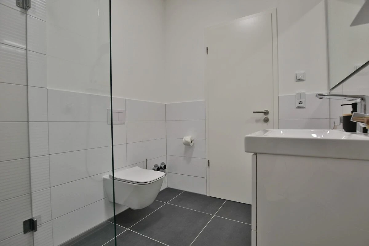 Das Badezimmer mit Tageslicht verfügt über eine ebenerdige Dusche mit Glasfront, einen großzügigen Waschtisch und genügend Stauraummöglichkeiten für Ihre Hygieneartikel.