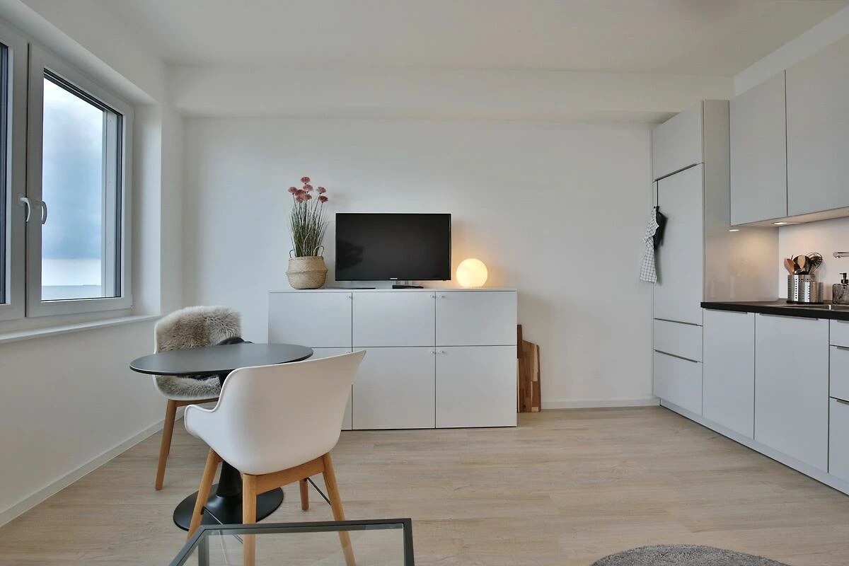 Eine vollausgestattete Pantryküche, ein runder Esstisch mit 2 Stühlen, ein Sideboard mit einem Fernsehgerät und vor allem der Meerblick runden den Wohn-und Essbereich ab.