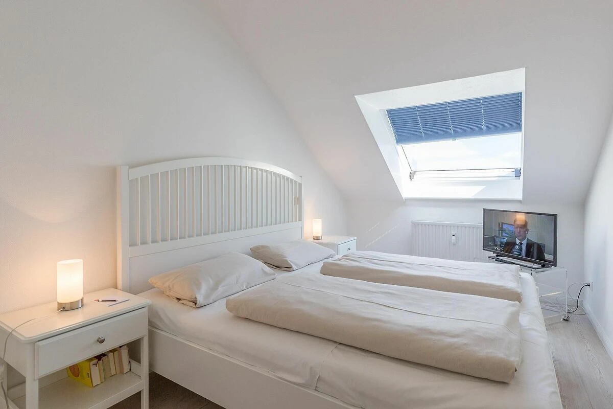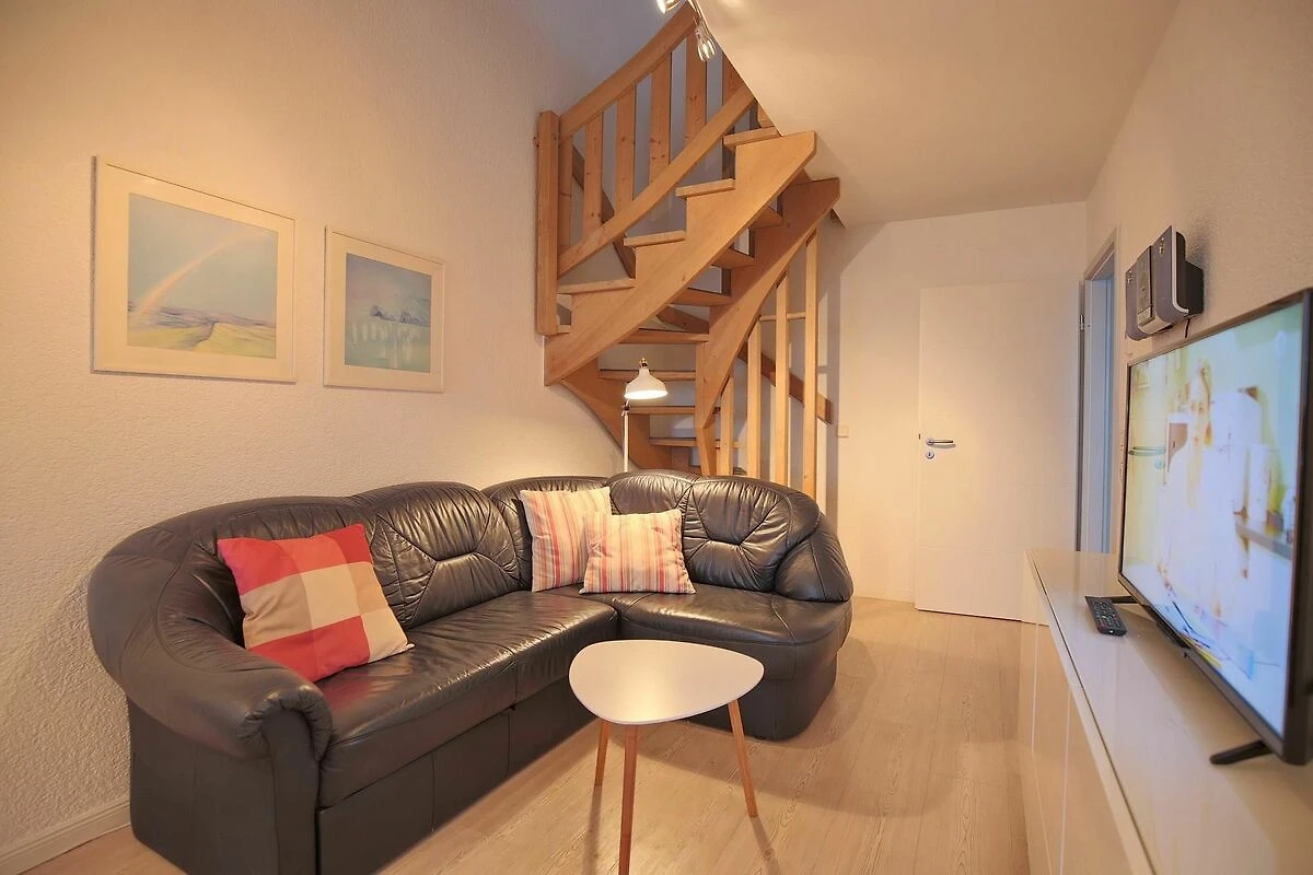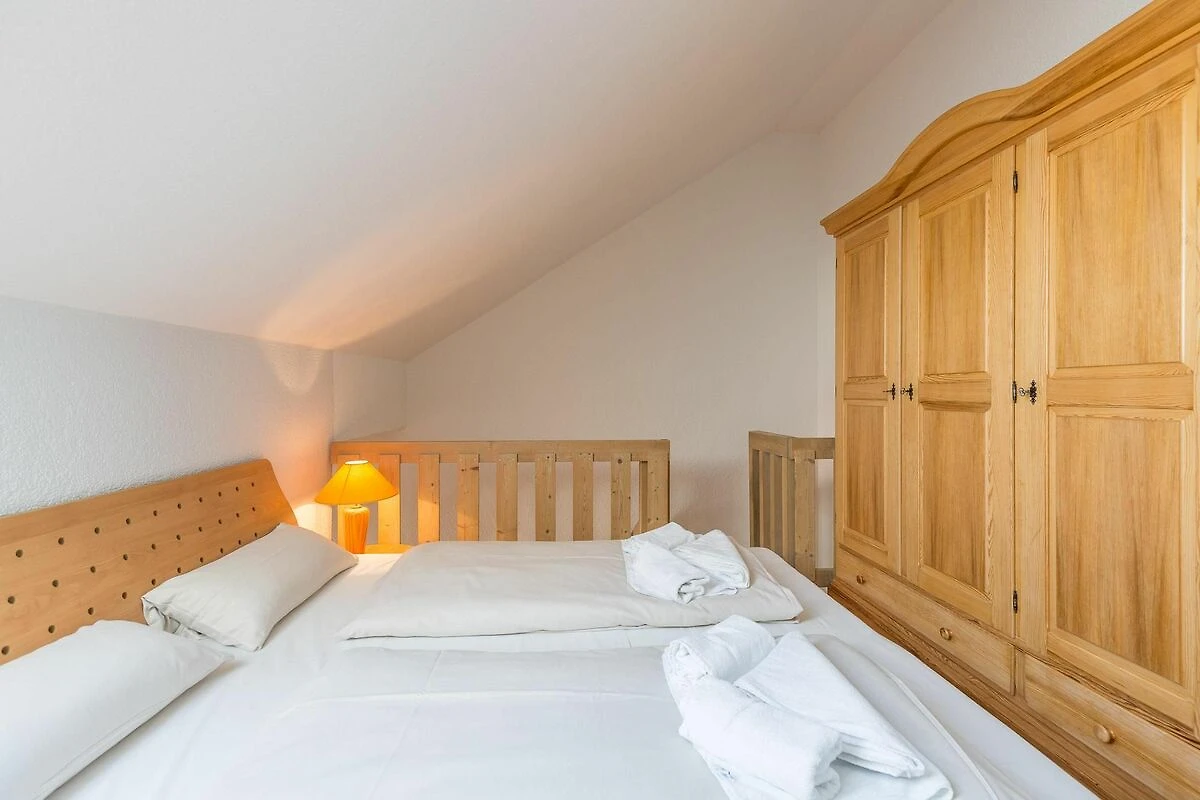 Der 1. Schlafraum befindet sich auf dieser Ebene und ist mit Doppelbett (1,80m x 2,00m) ausgestattet. Der 2. Schlafraum (als Schlafgalerie) ist vom Wohnbereich über eine Treppe zu erreichen und verfügt ebenfalls über ein Doppelbett (1,80 m x 2,00 m) und einen geräumigen Kleiderschrank. Sowohl der Wohnraum als auch beide Schlafräume sind mit Laminat ausgelegt. Ein Duschbad mit WC macht die Ausstattung der Wohnung komplett.